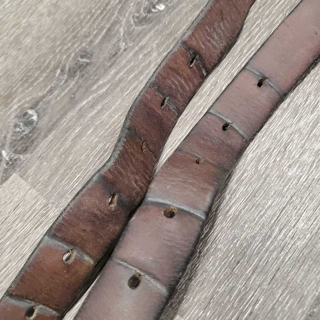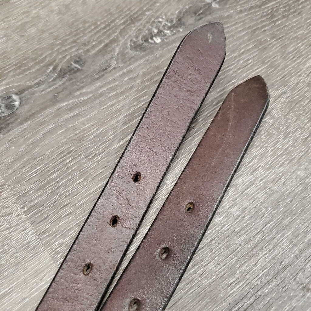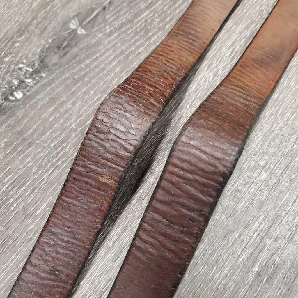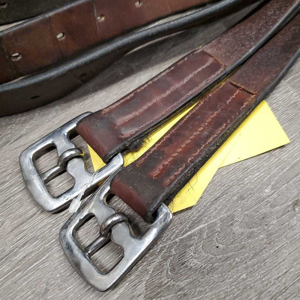 Pr Stirrup Leathers *fair/gc, clean, stains, v.rubbed, dented & creased, xholes, thin spots, bent, dry, stiff, older, uneven, Light CRACKING