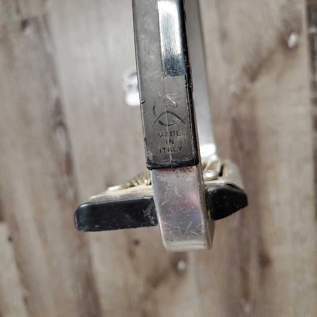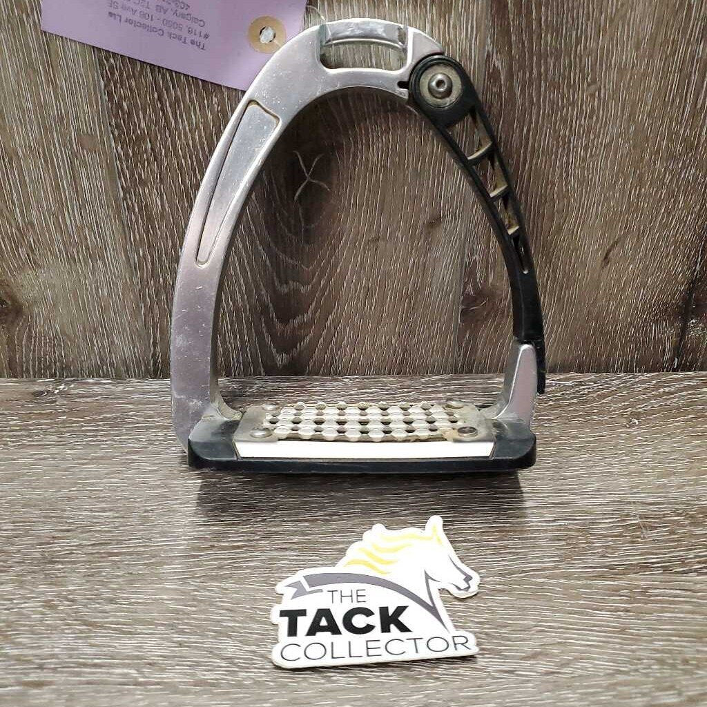 feature a patented side opening and an advanced technical composition thanks to an innovative injection molding. Made with high-tech metal and flexible polymers, they offer more comfort and less stiffness than traditional stirrups. The stainless steel upper features horizontal holes to ensure optimal grip in all conditions, while protecting the stirrups from corrosion. The strategically-placed lock and release mechanism prevents accidental slipping. Developed and manufactured in Italy. Safety stirrups Patented side opening Less stiff than traditional stirrups Lock and release mechanism prevents slipping Weight - 760 g Tread width - 12.5 cm Maximum load - 150 kg Maximum arm opening - 105 mm