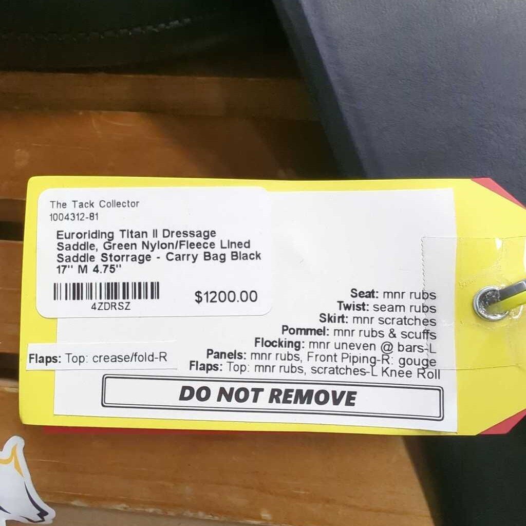 17" M 4.75" Euroriding Titan II Dressage Saddle, Green Nylon/Fleece Lined Saddle Storage - Carry Bag, Wool Flocking, xlg Rear Gusset Panels, XLg External Front Blocks, Flaps: 16.5"L x 11"W Serial #: 302 080 323 17