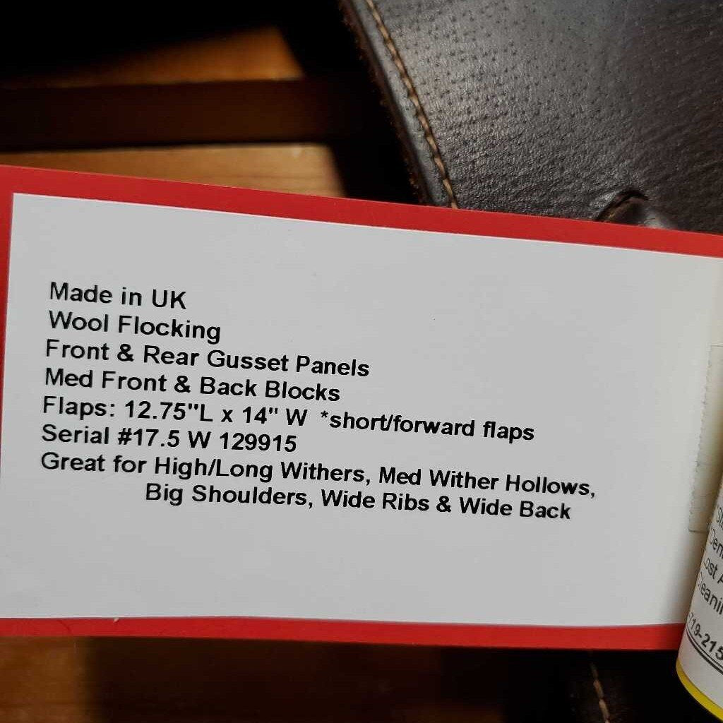 17.5" W *5.5" Sankey Jacinda Close Contact Saddle, 2 Billet Guards, Sankey Nylon Black Cover, Med Front & Back Blocks, Wool Flocking, Front & Rear Gusset Panels, Flaps: 12.75"L x 14" W Serial #17.5 W 129915