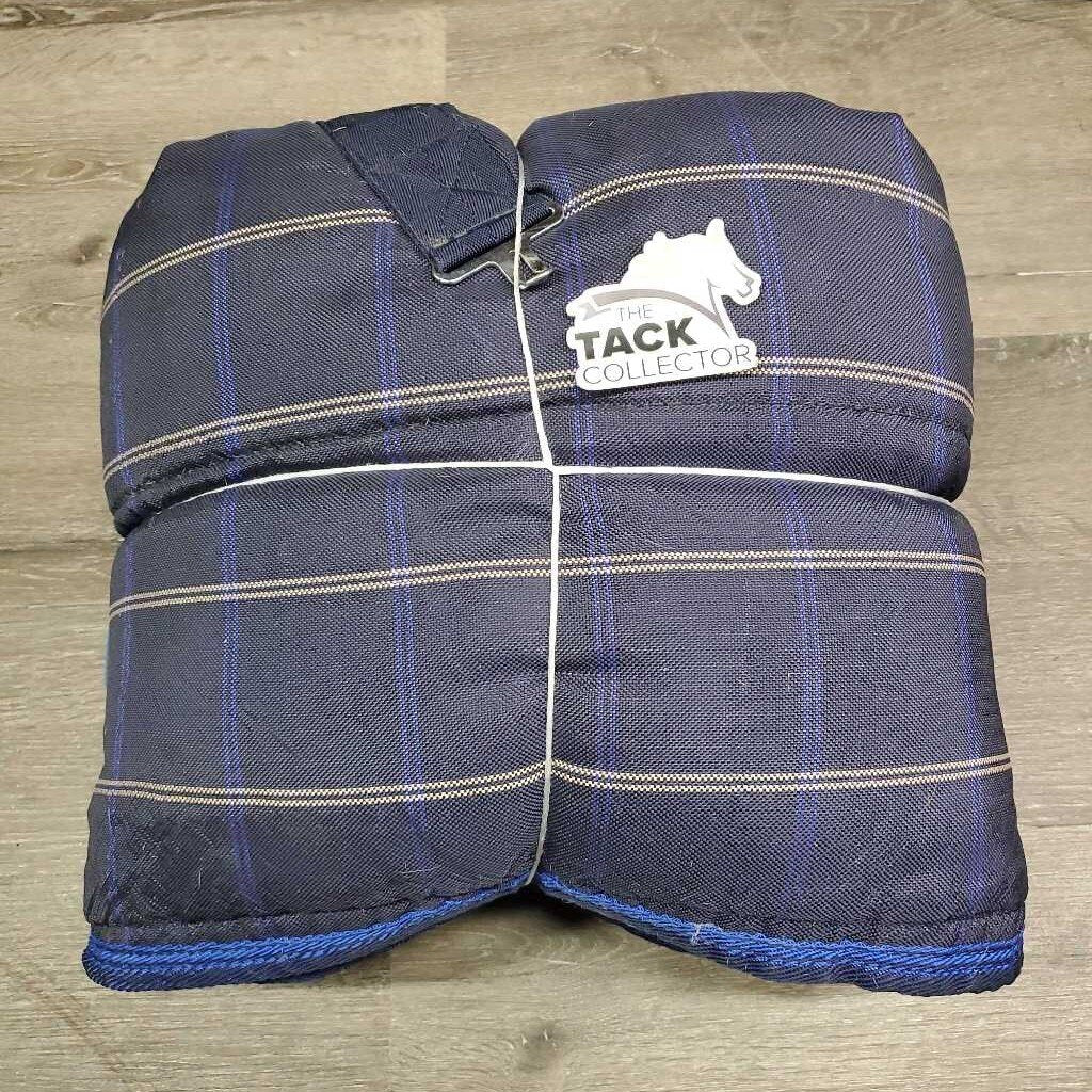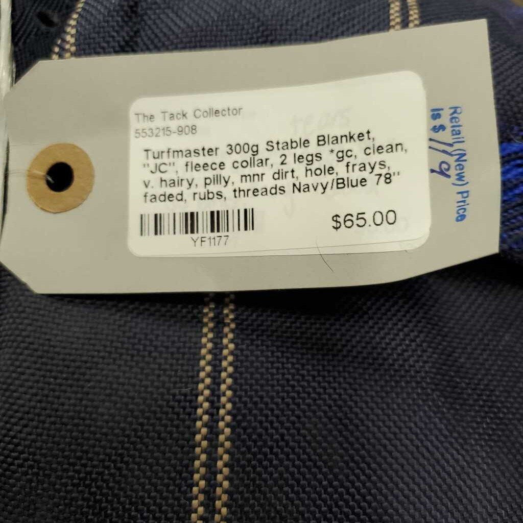 300g Stable Blanket, "JC", fleece collar, 2 legs *gc, clean, v. hairy, pilly, mnr dirt, hole, frays, faded, rubs, threads