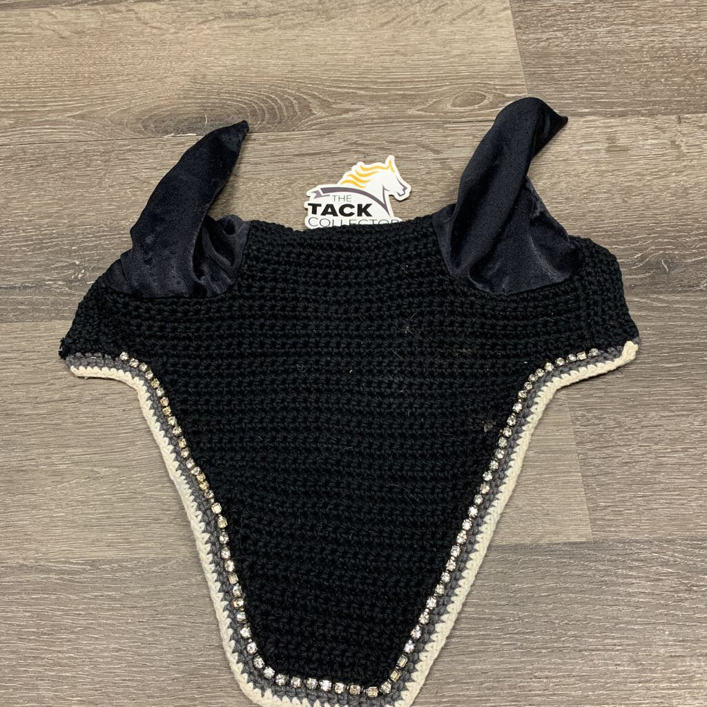 ?Custom Made Crochet Fly Veil Ear Bonnet, 1x Bling *gc, snags, folded & hairyear end, inside: mnr dirt, hair & faded, curled end