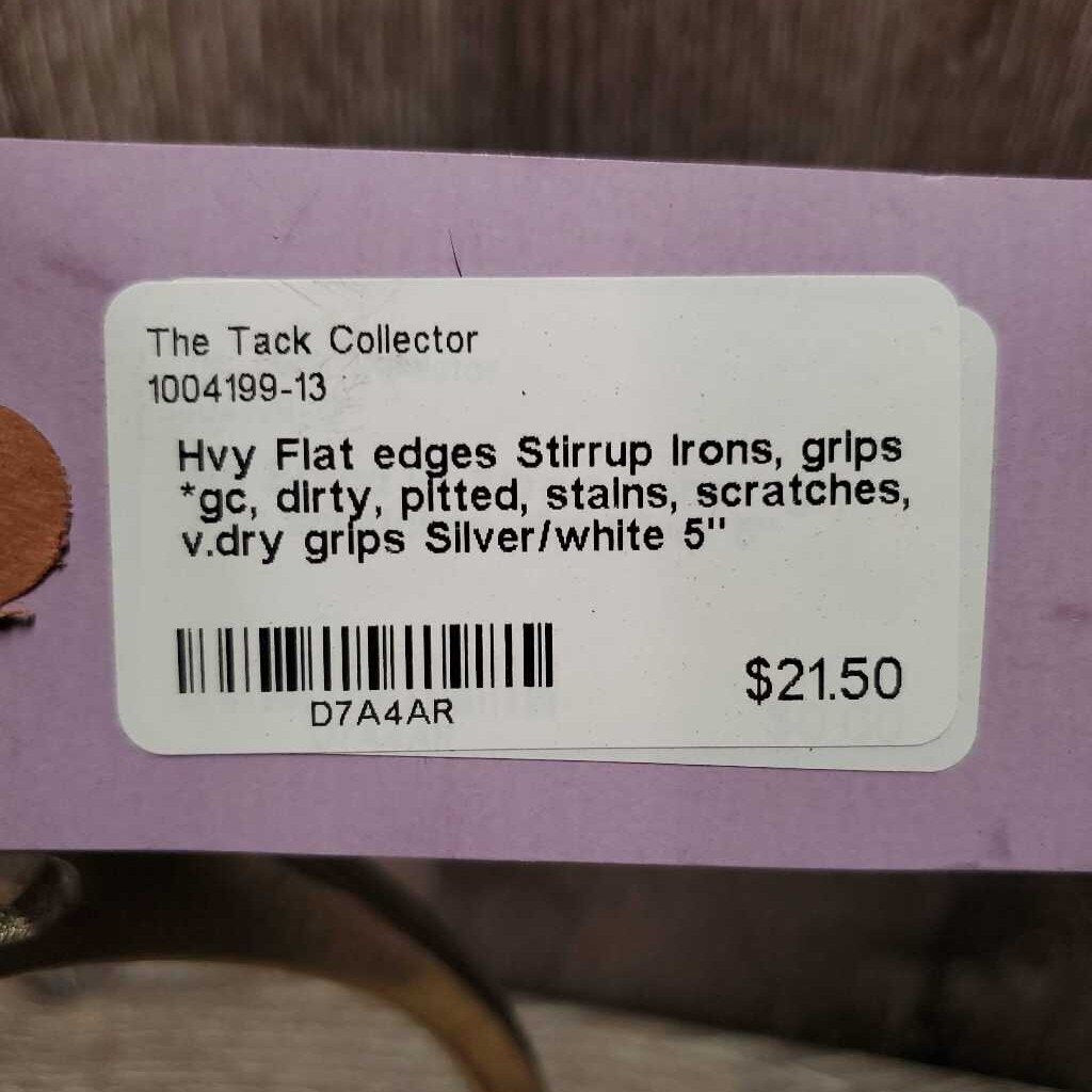 Hvy Flat edges Stirrup Irons, grips *gc, dirty, pitted, stains, scratches, v.dry grips