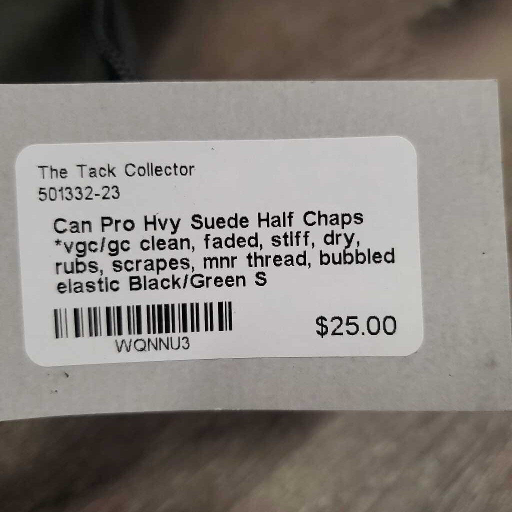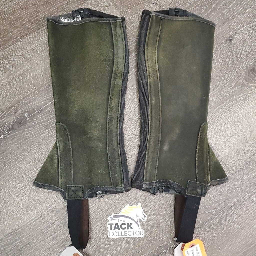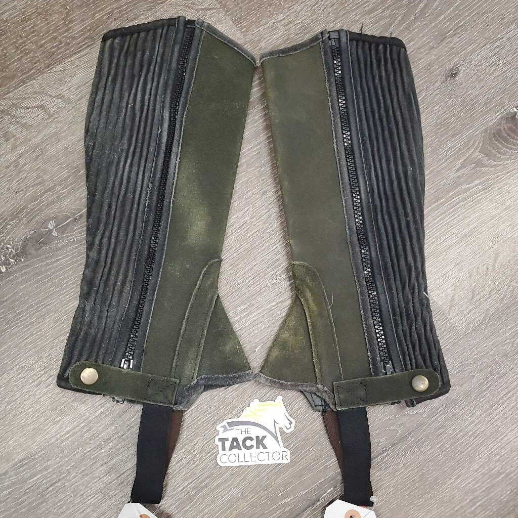 Hvy Suede Half Chaps *vgc/gc clean, faded, stiff, dry, rubs, scrapes, mnr thread, bubbled elastic