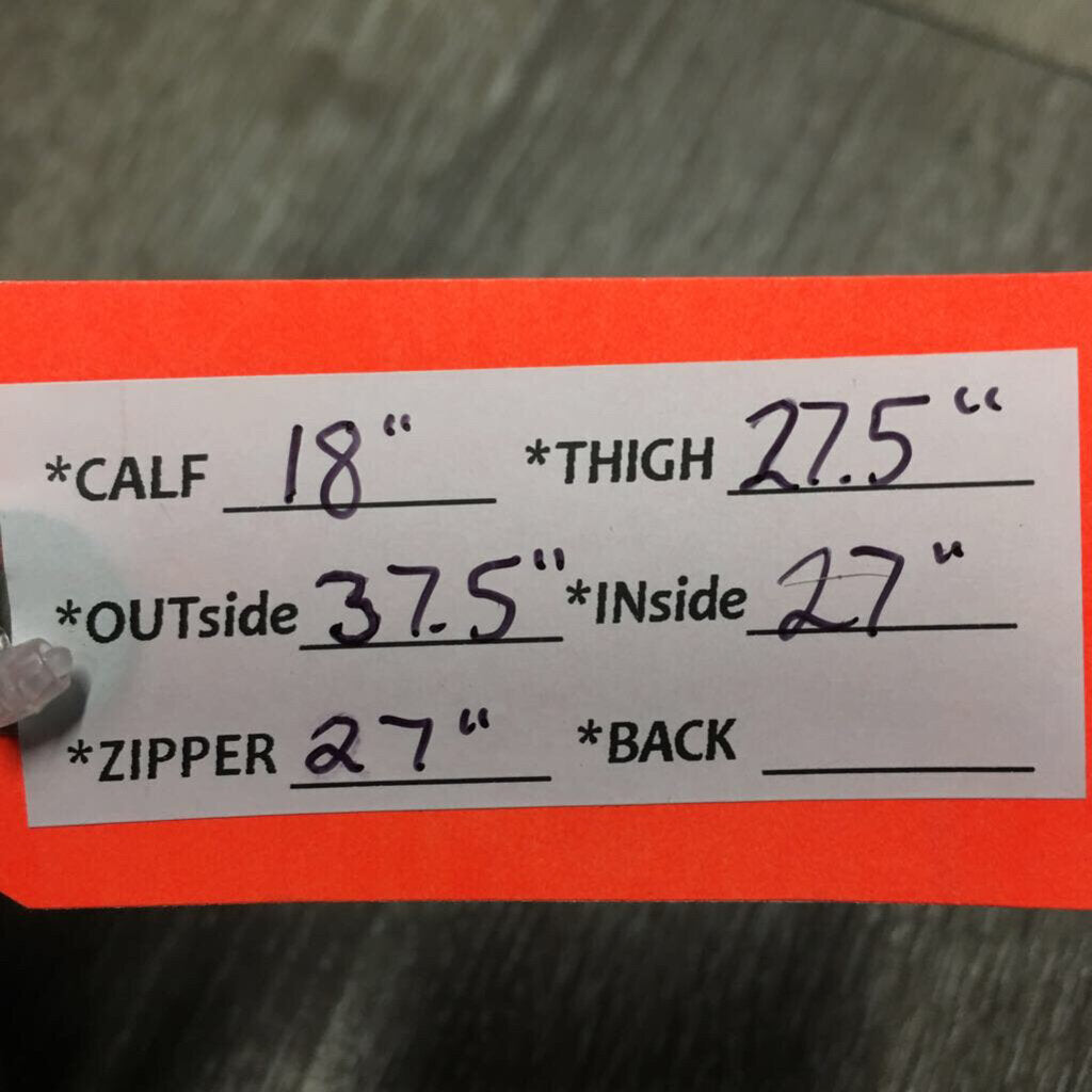 Calf 18", Outside 37.5", Zipper 27", Thigh 27.5", Inside 27", Back 41"