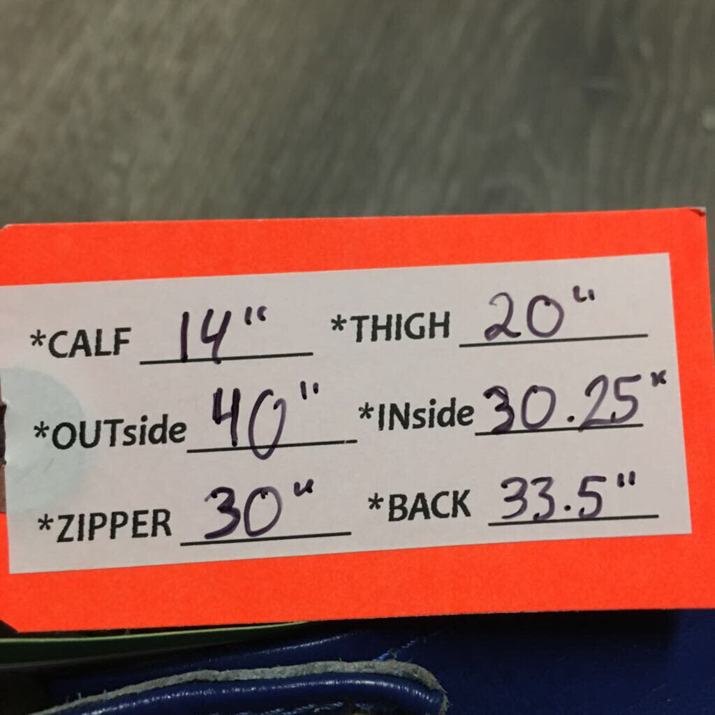 Calf 14", Outside 40", Zipper 30", Thigh 20", Inside 30.25", Back 33.5"