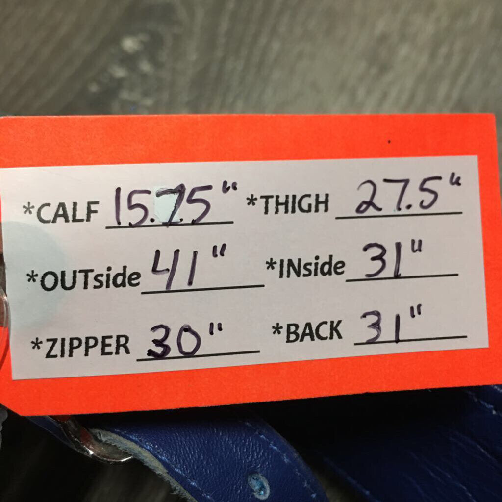 Calf 15.75", Outside 41", Zipper 30", Thigh 27.5", Inside 31", Back 31"