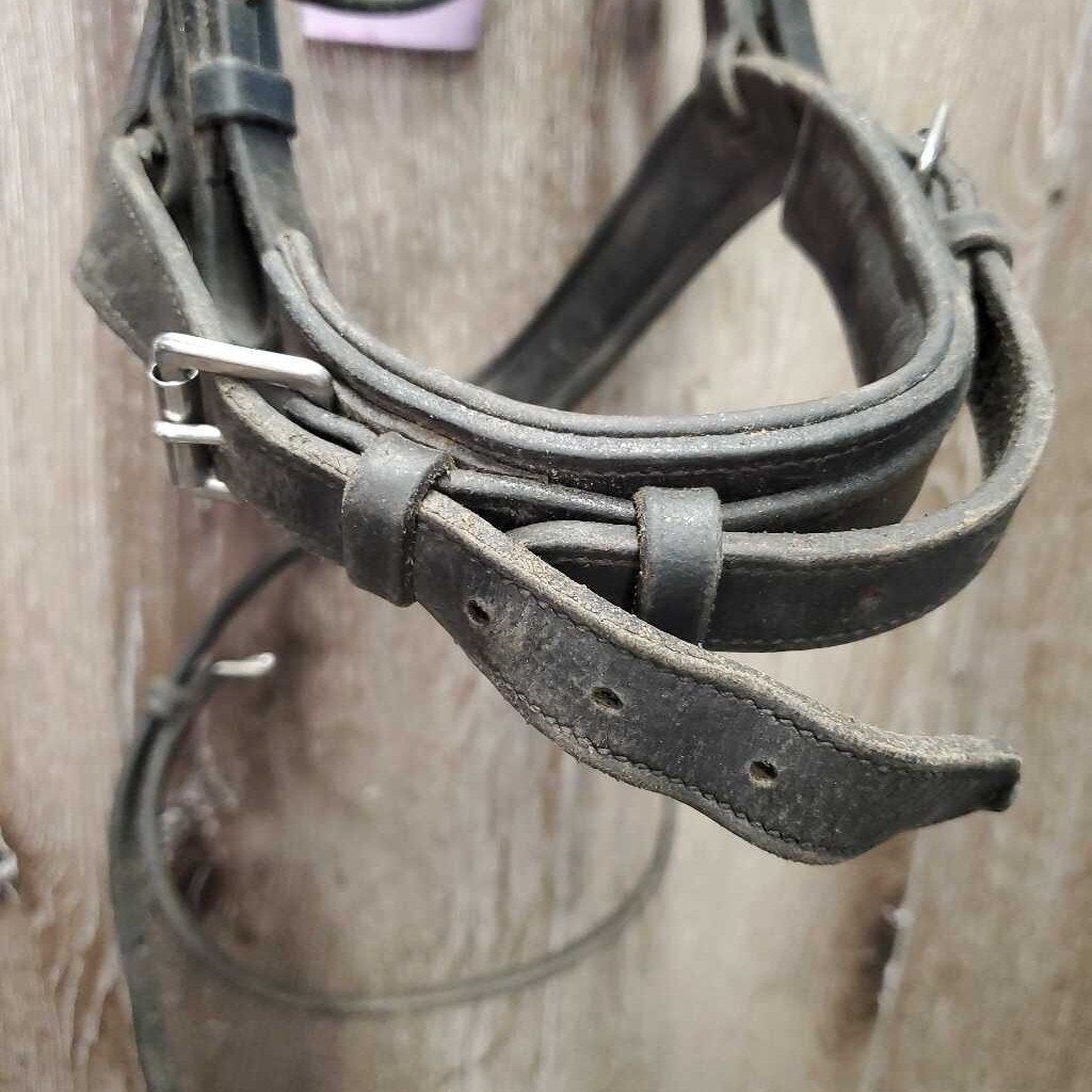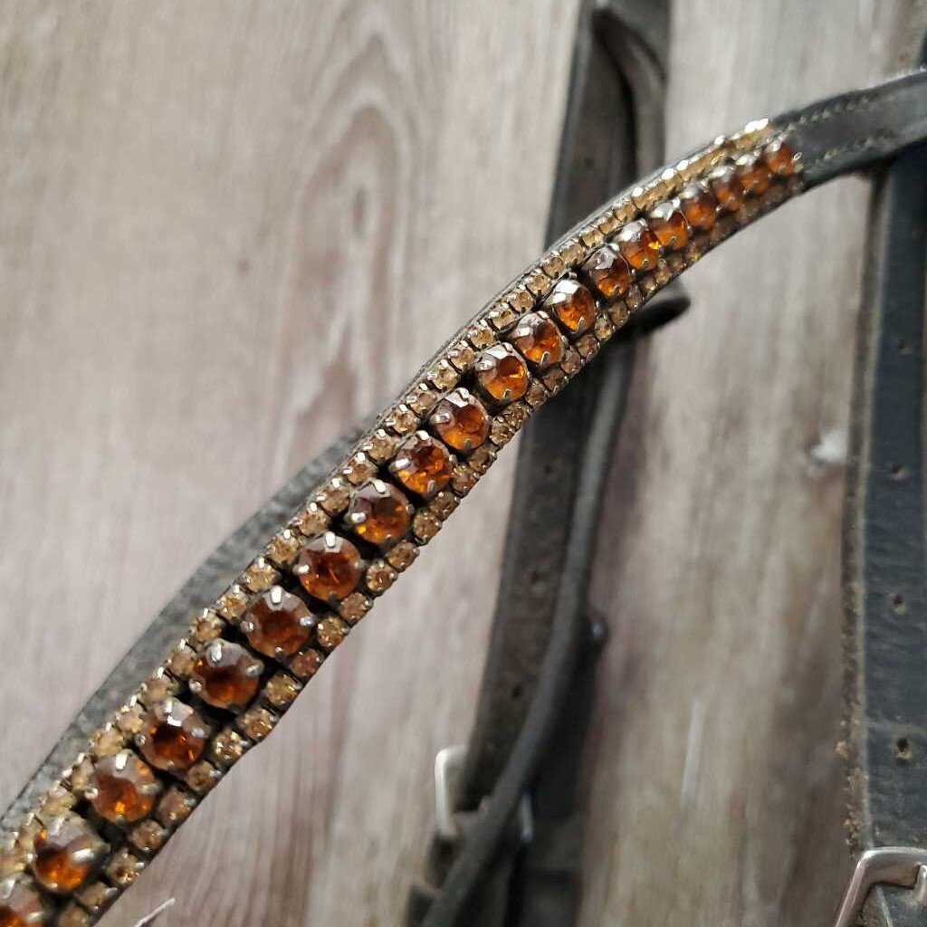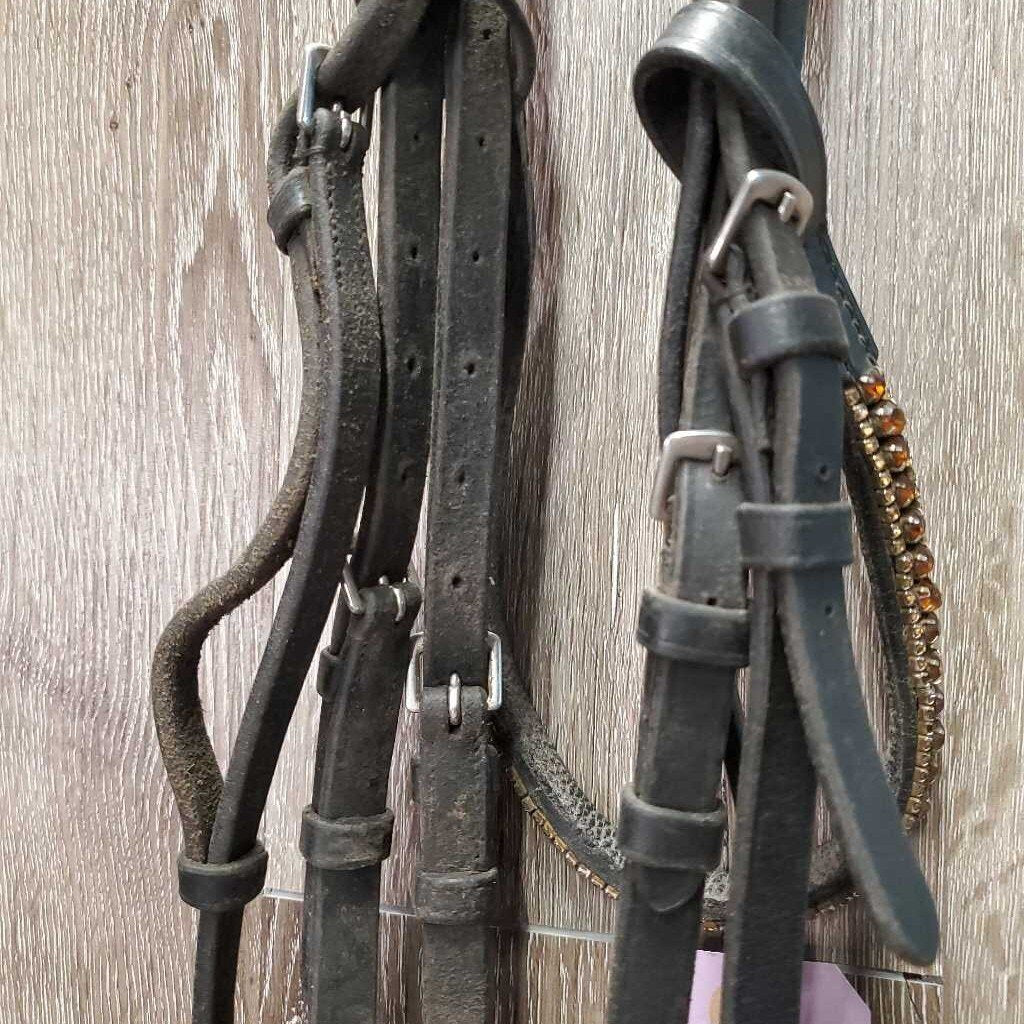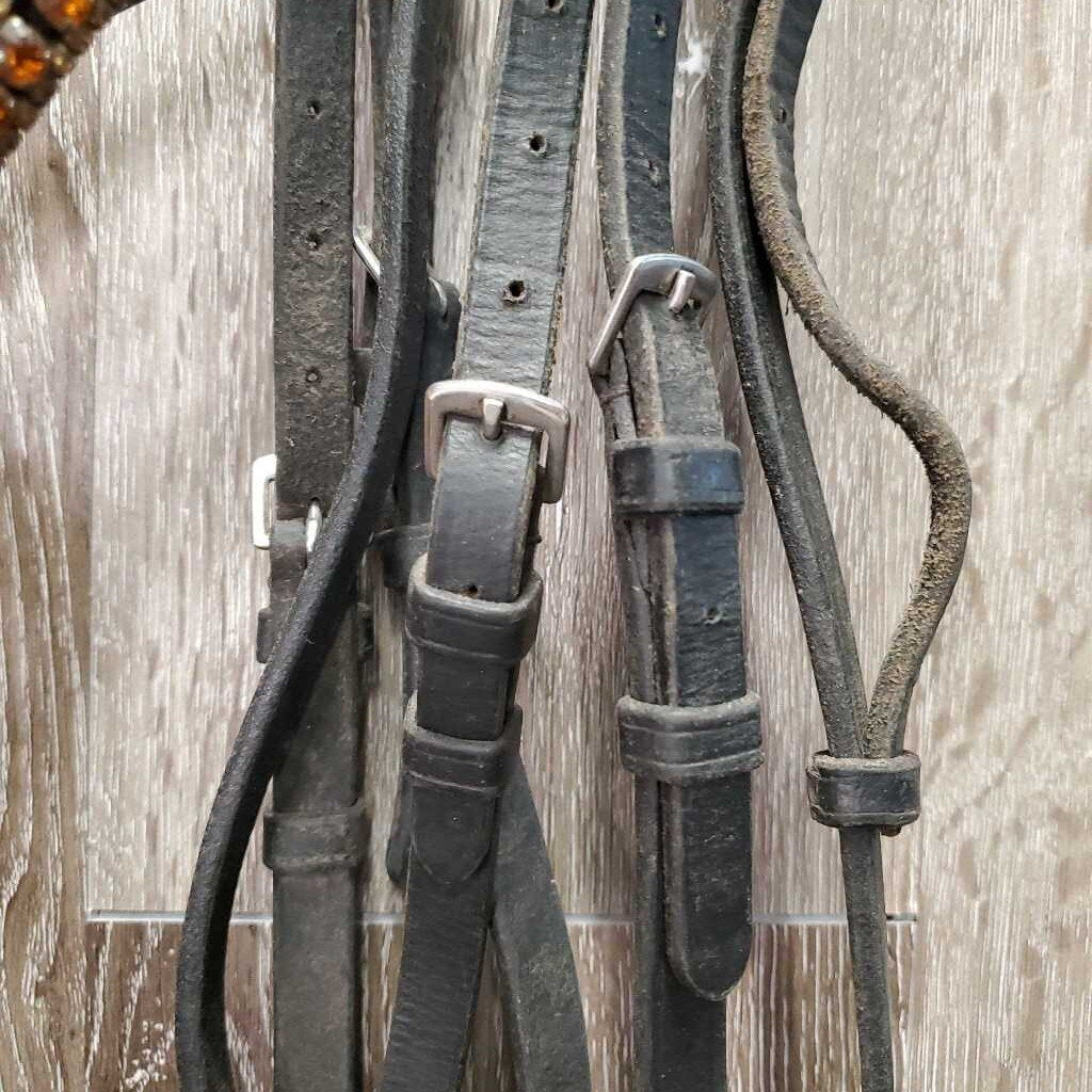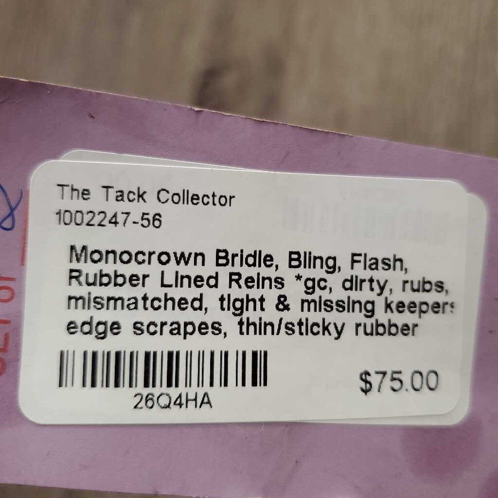 Monocrown Bridle, Bling, Flash, Rubber Lined Reins *gc, dirty, rubs, mismatched, tight & missing keepers, edge scrapes, thin/sticky rubber