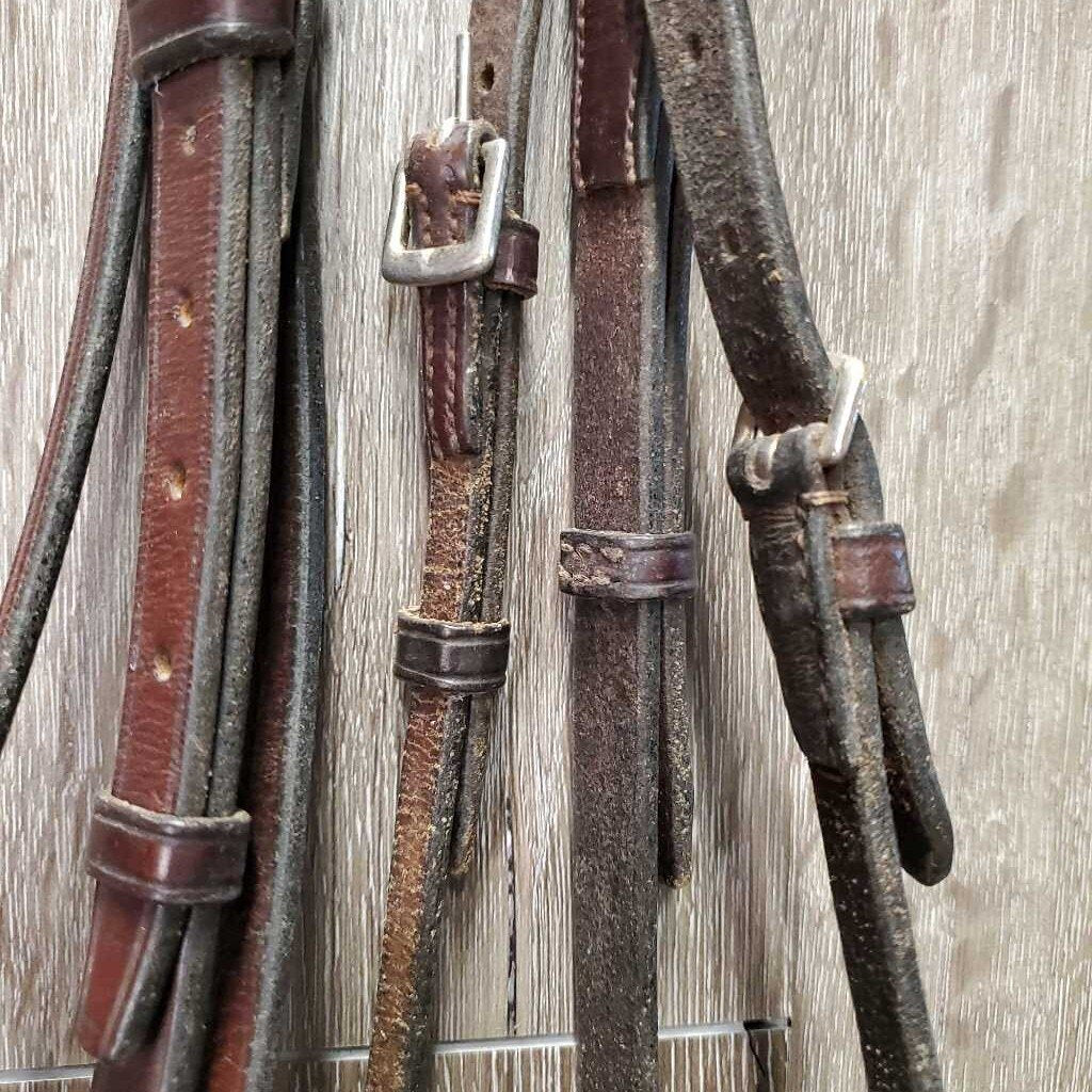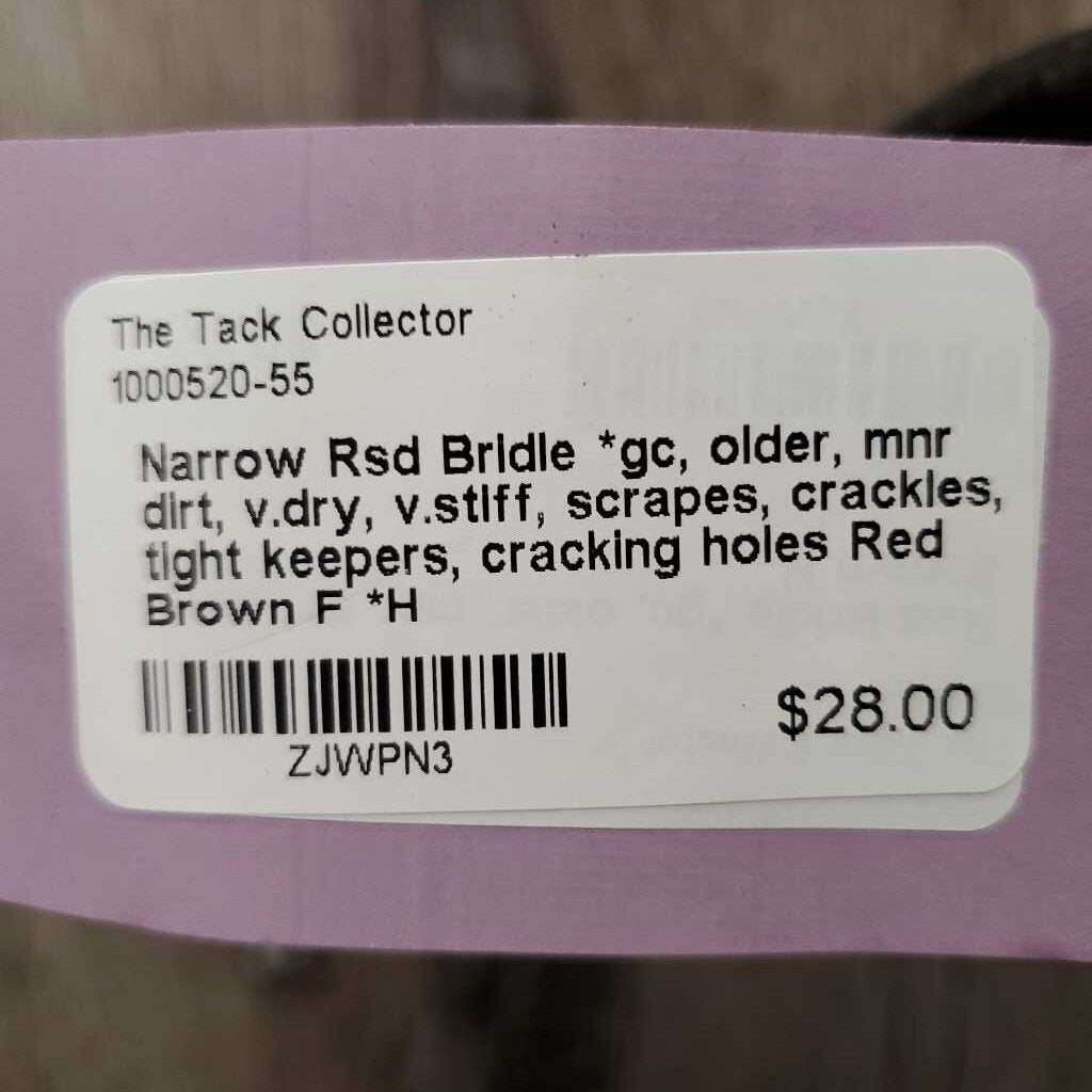 Narrow Rsd Bridle *gc, older, mnr dirt, v.dry, v.stiff, scrapes, crackles, tight keepers, cracking holes