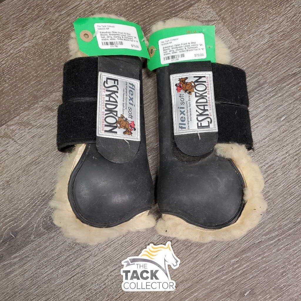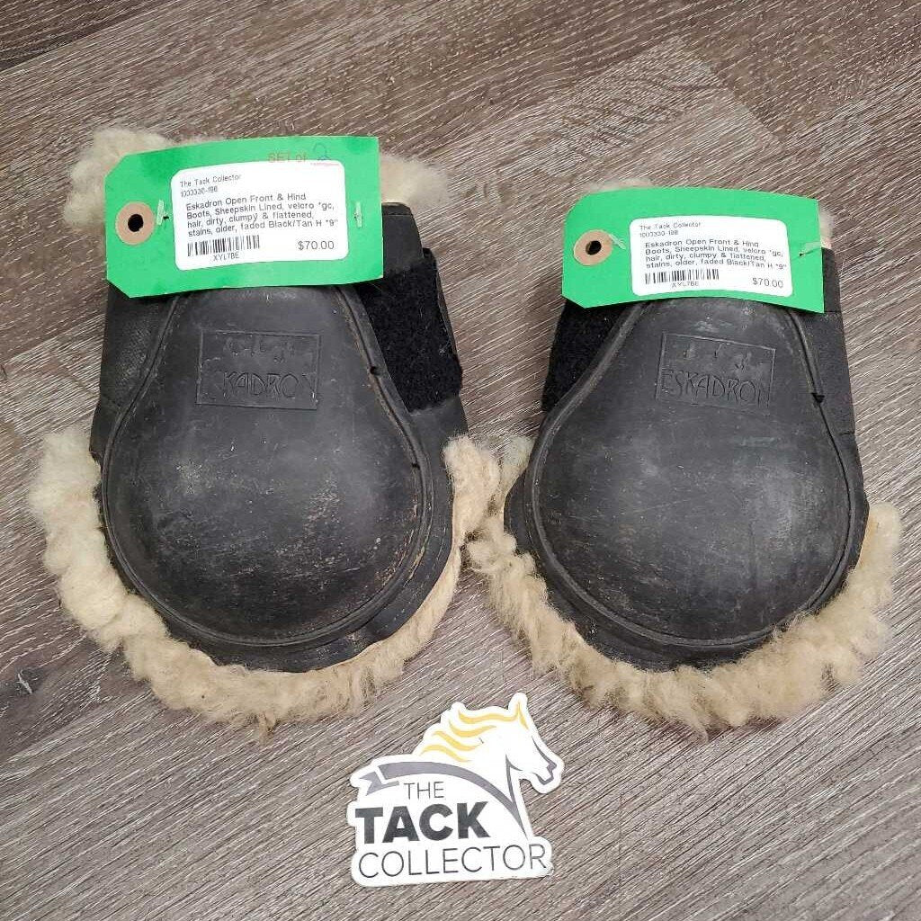 Open Front & Hind Boots, Sheepskin Lined, velcro *gc, hair, dirty, clumpy & flattened, stains, older, faded