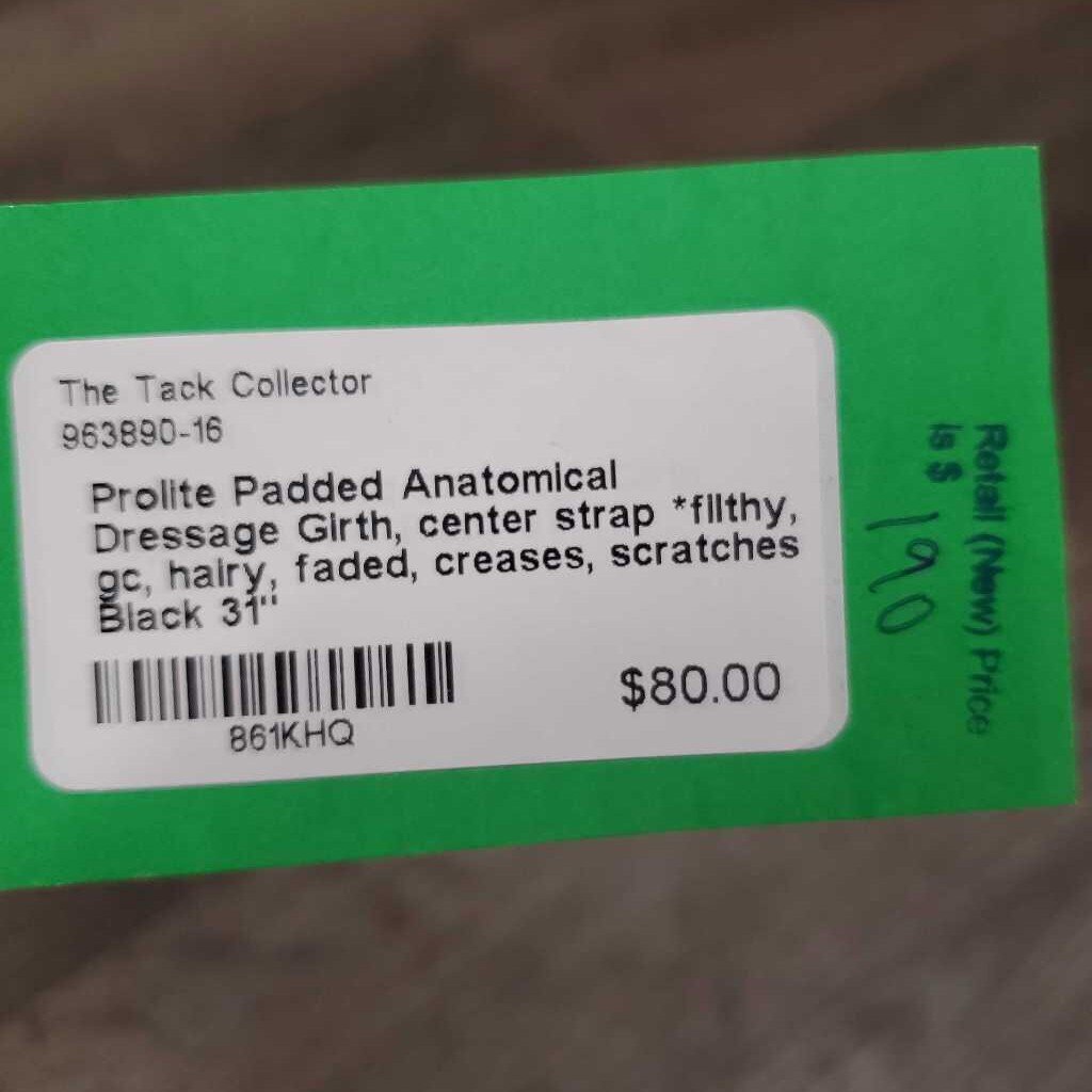 Padded Anatomical Dressage Girth, center strap *filthy, gc, hairy, faded, creases, scratches