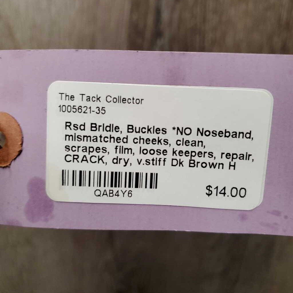 Rsd Bridle, Buckles *NO Noseband, mismatched cheeks, clean, scrapes, film, loose keepers, repair, CRACK, dry, v.stiff