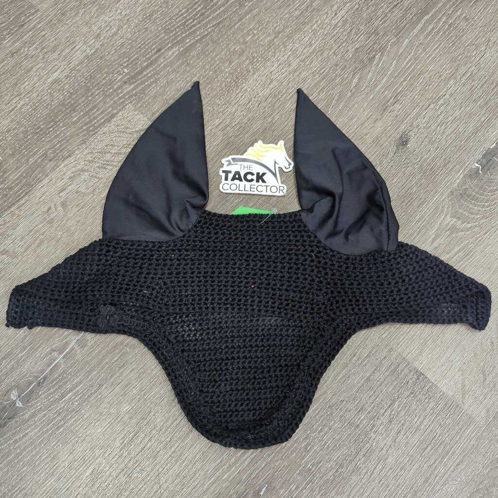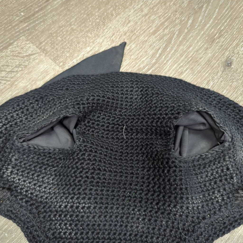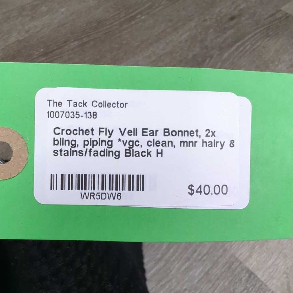 Soft Crochet Fly Veil Ear Bonnet, 2x bling, piping *vgc, clean, mnr hairy & stains/fading