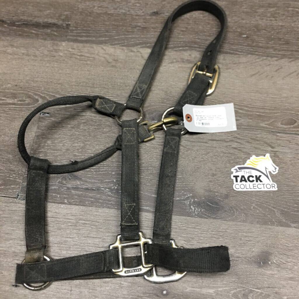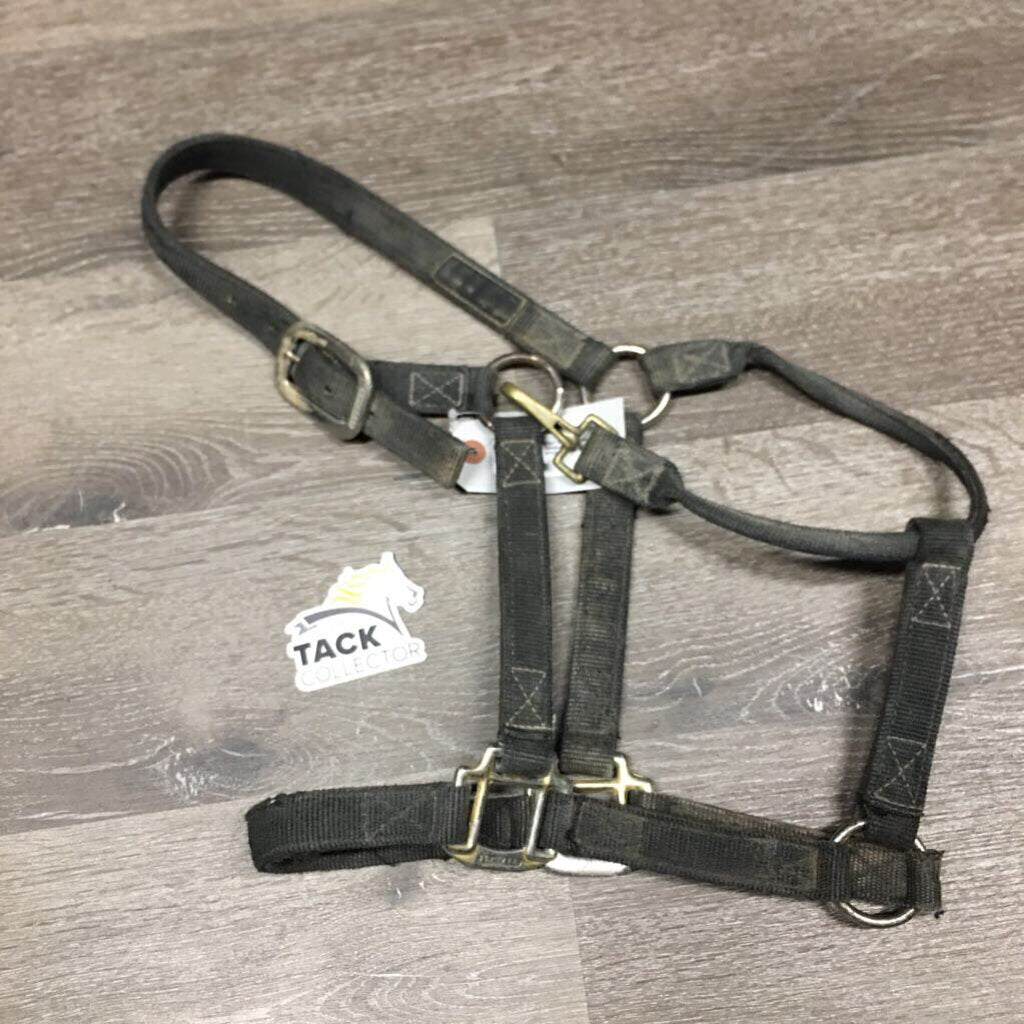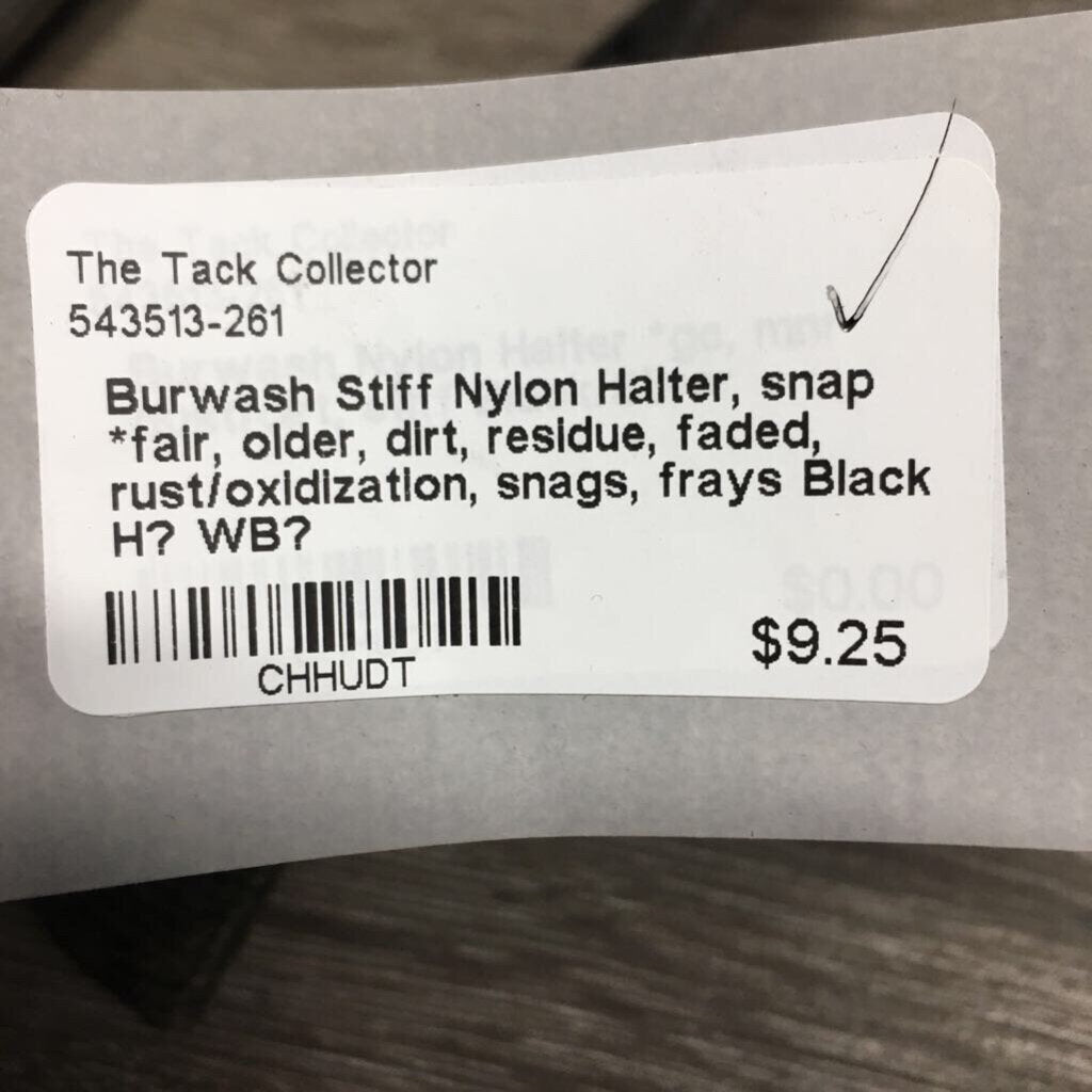 Stiff Nylon Halter, snap *fair, older, dirt, residue, faded, rust/oxidization, snags, frays