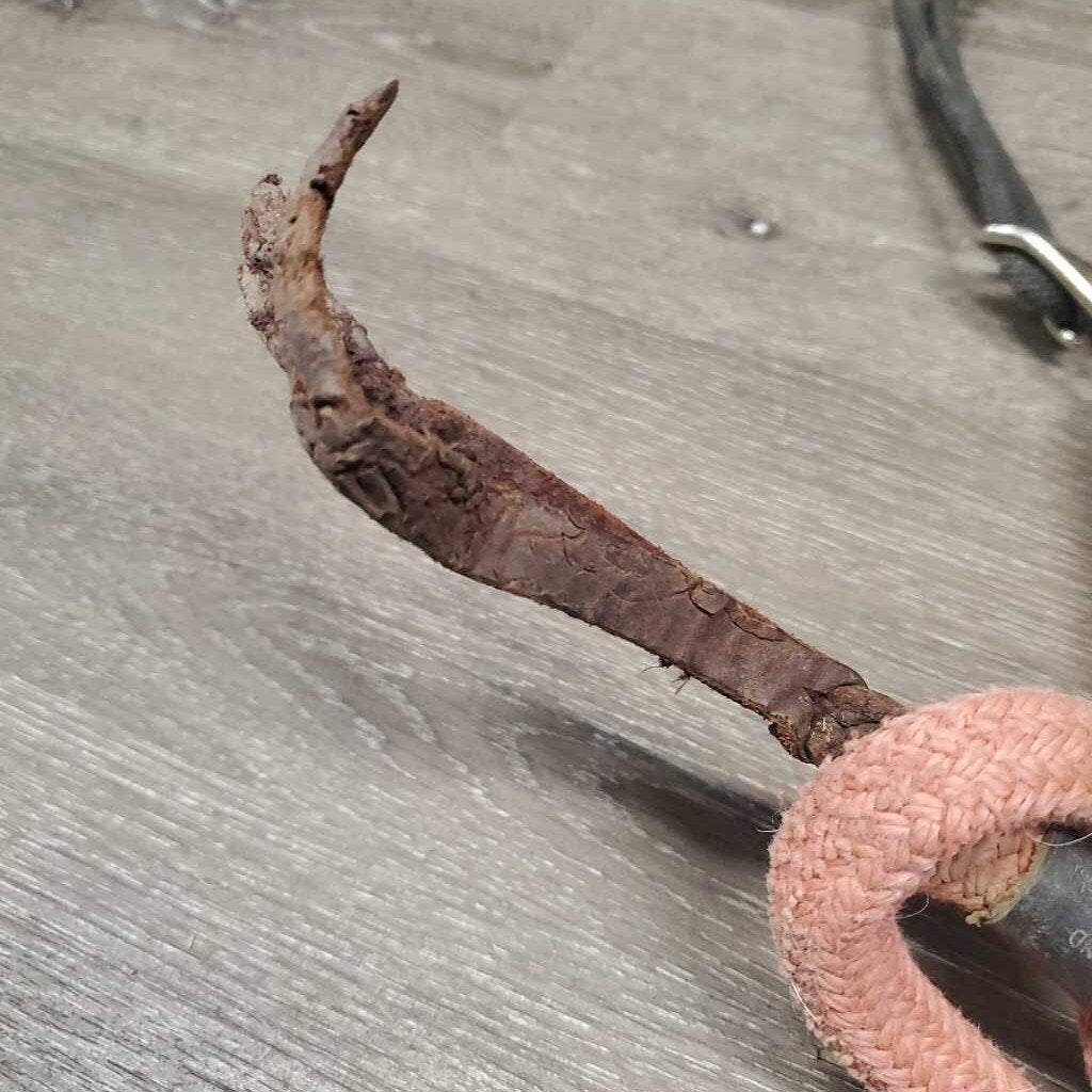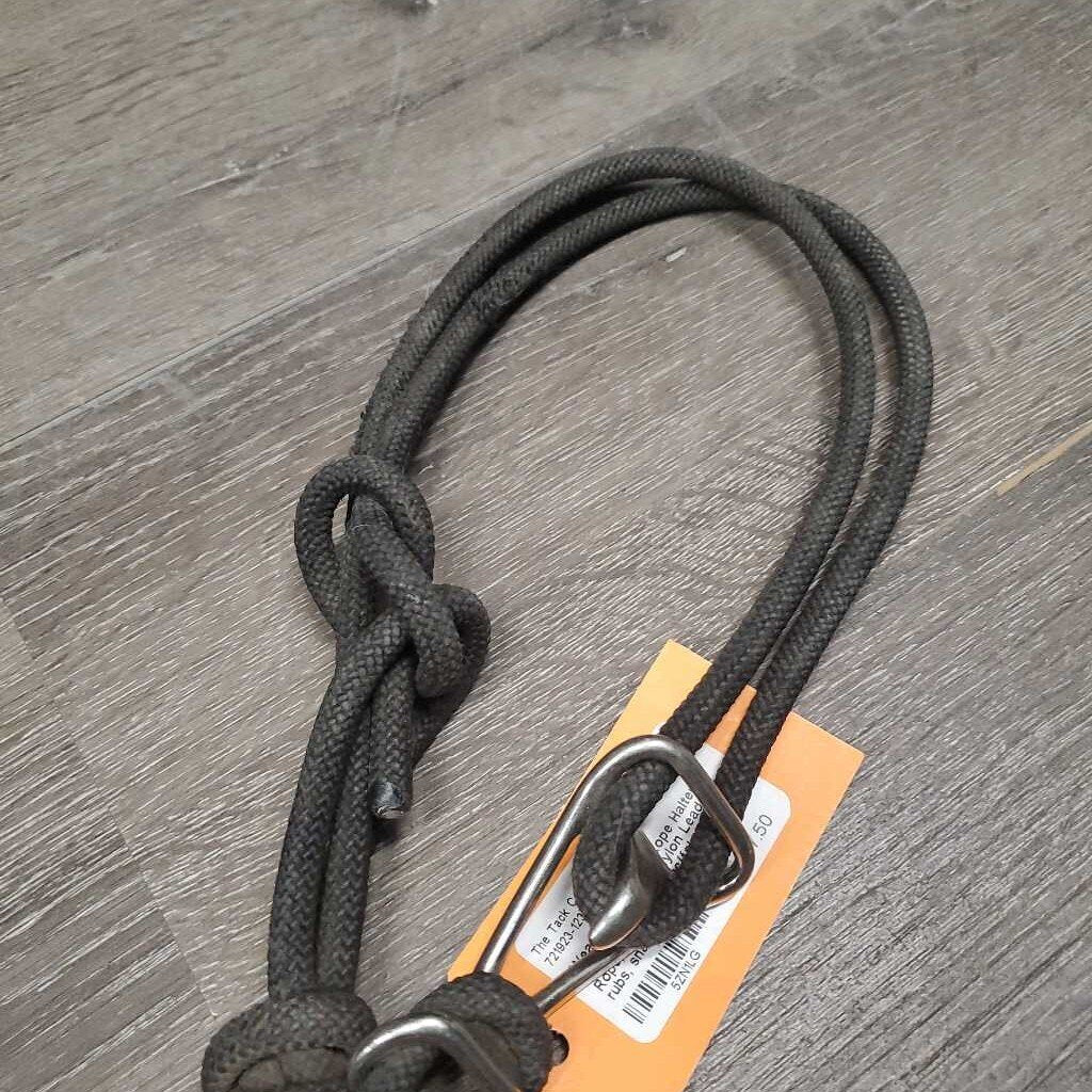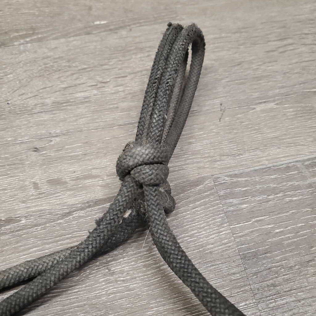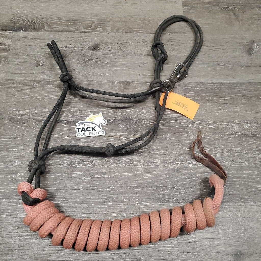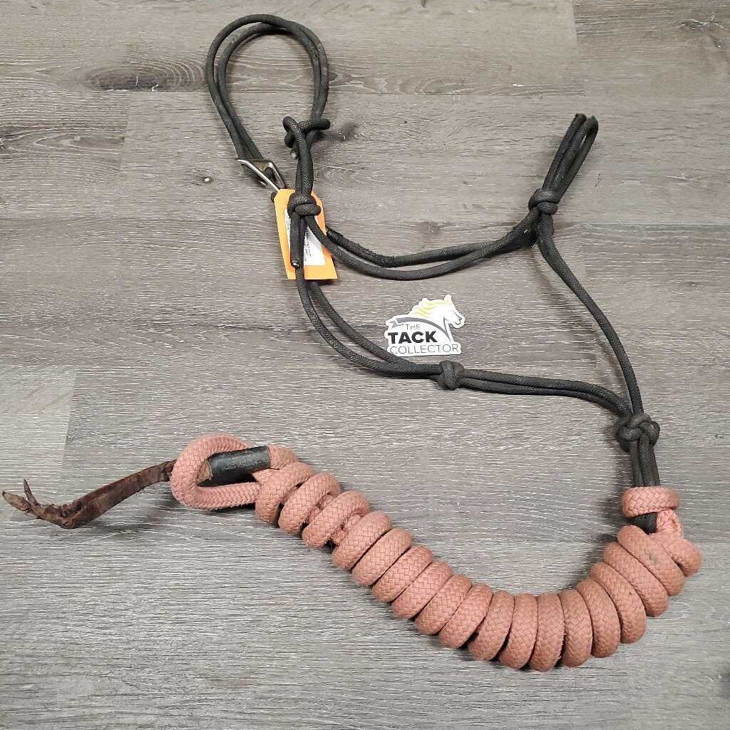 Stiff Nylon Rope Halter, attached Burwash Nylon Lead Rope, leather end *gc/fair, v.frayed, rubs, snags & dirty, no side knot