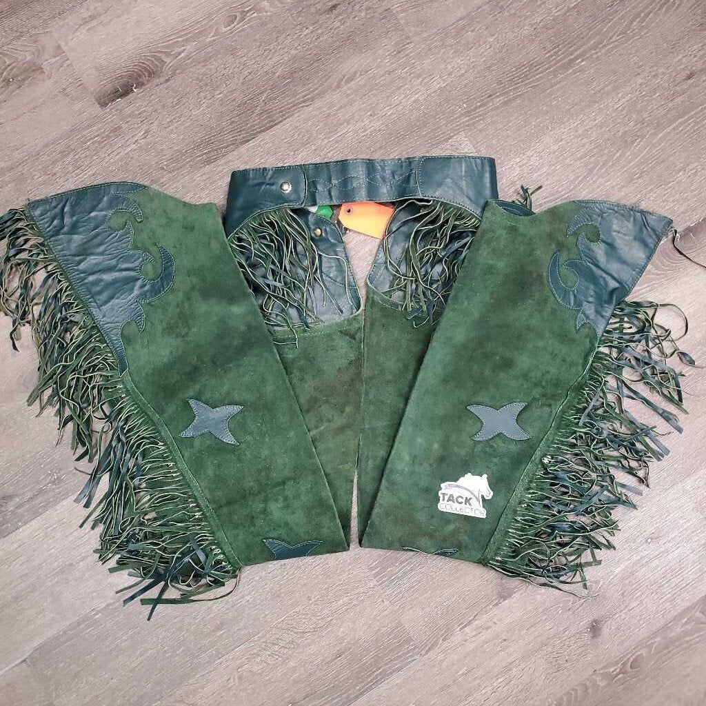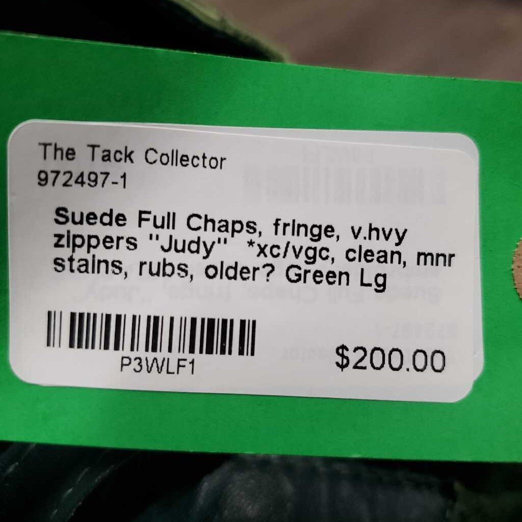 Suede Full Chaps, fringe, v.hvy zippers "Judy" *xc/vgc, clean, mnr stains, rubs, older?