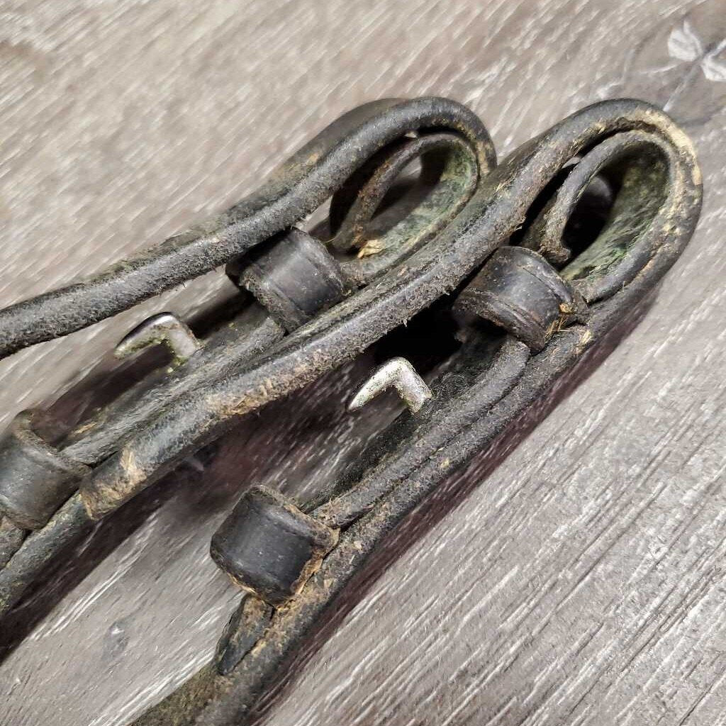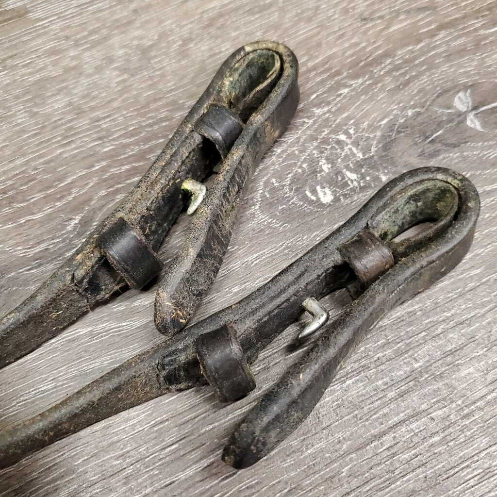 Thick Plain Leather Reins *gc/fair, discolored, residue, scrapes, loose hook, dry, stiff