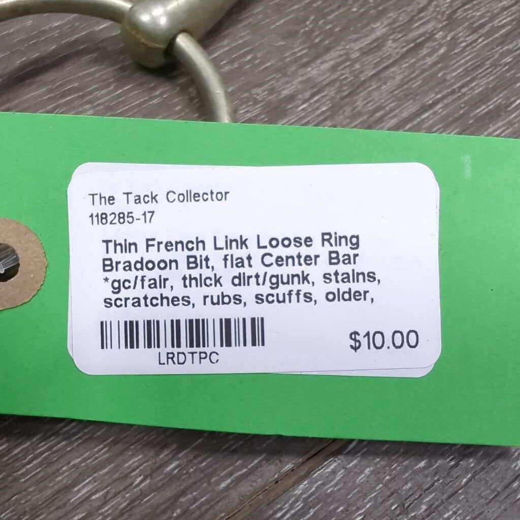 Thin French Link Loose Ring Bradoon Bit, flat Center Bar *gc/fair, thick dirt/gunk, stains, scratches, rubs, scuffs, older, oxidized