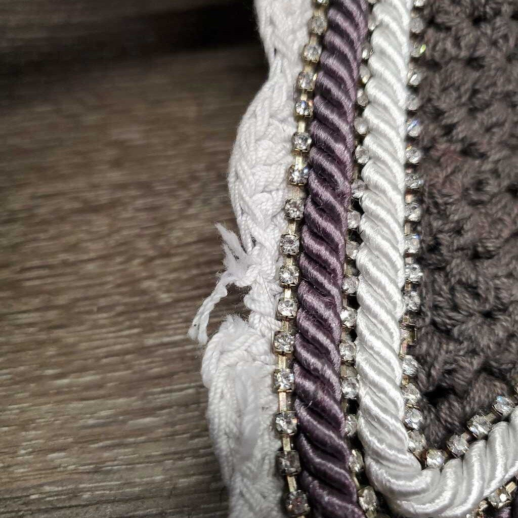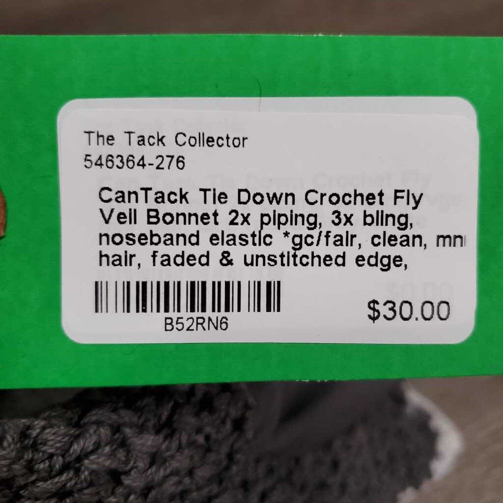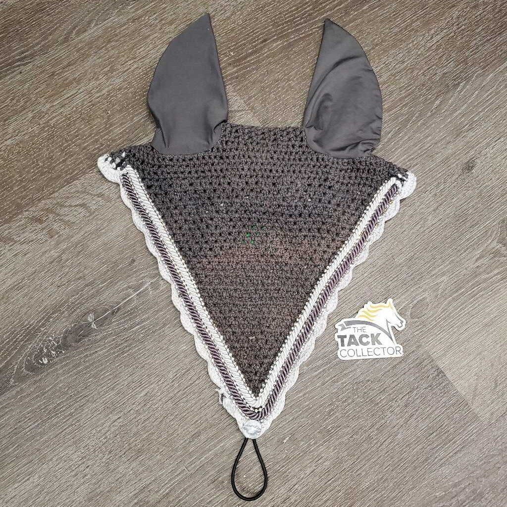 Tie Down Crochet Fly Veil Bonnet 2x piping, 3x bling, noseband elastic *gc/fair, clean, mnr hair, faded & unstitched edge, missing bling