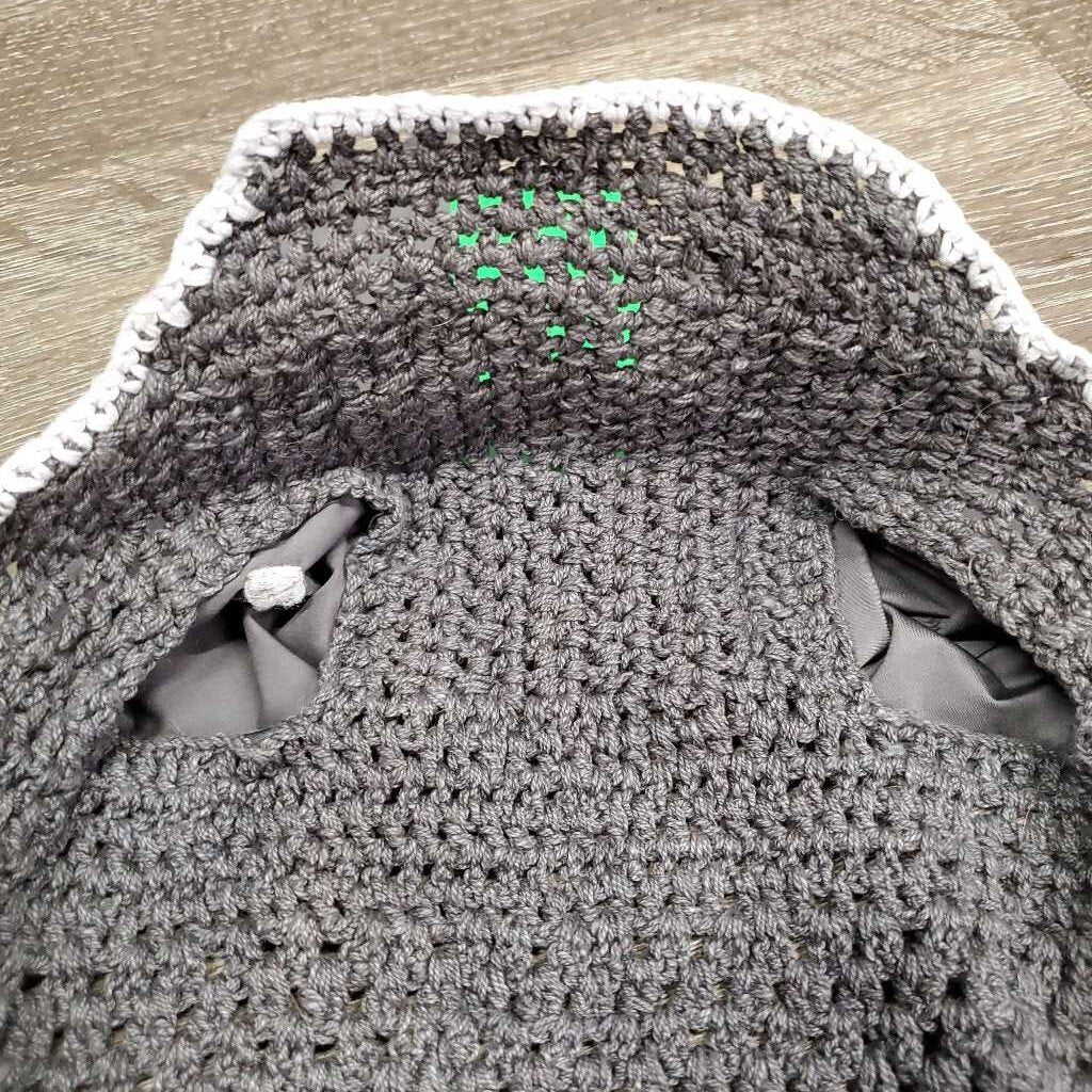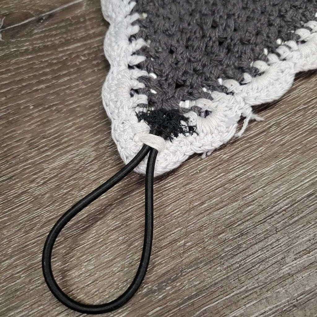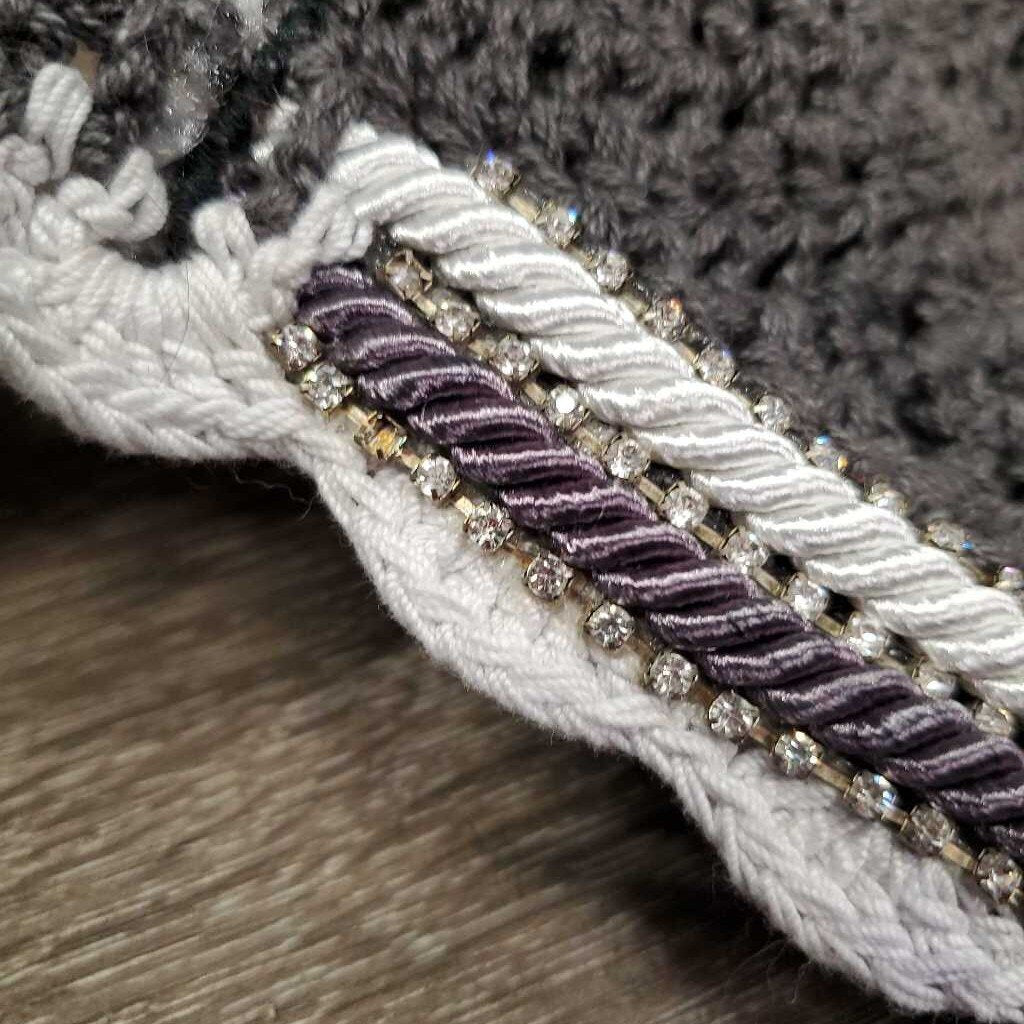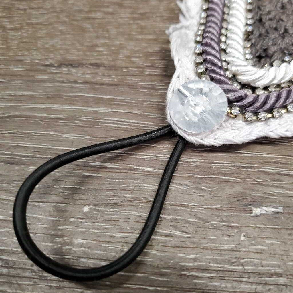Tie Down Crochet Fly Veil Bonnet 2x piping, 3x bling, noseband elastic *gc/fair, clean, mnr hair, faded & unstitched edge, missing bling