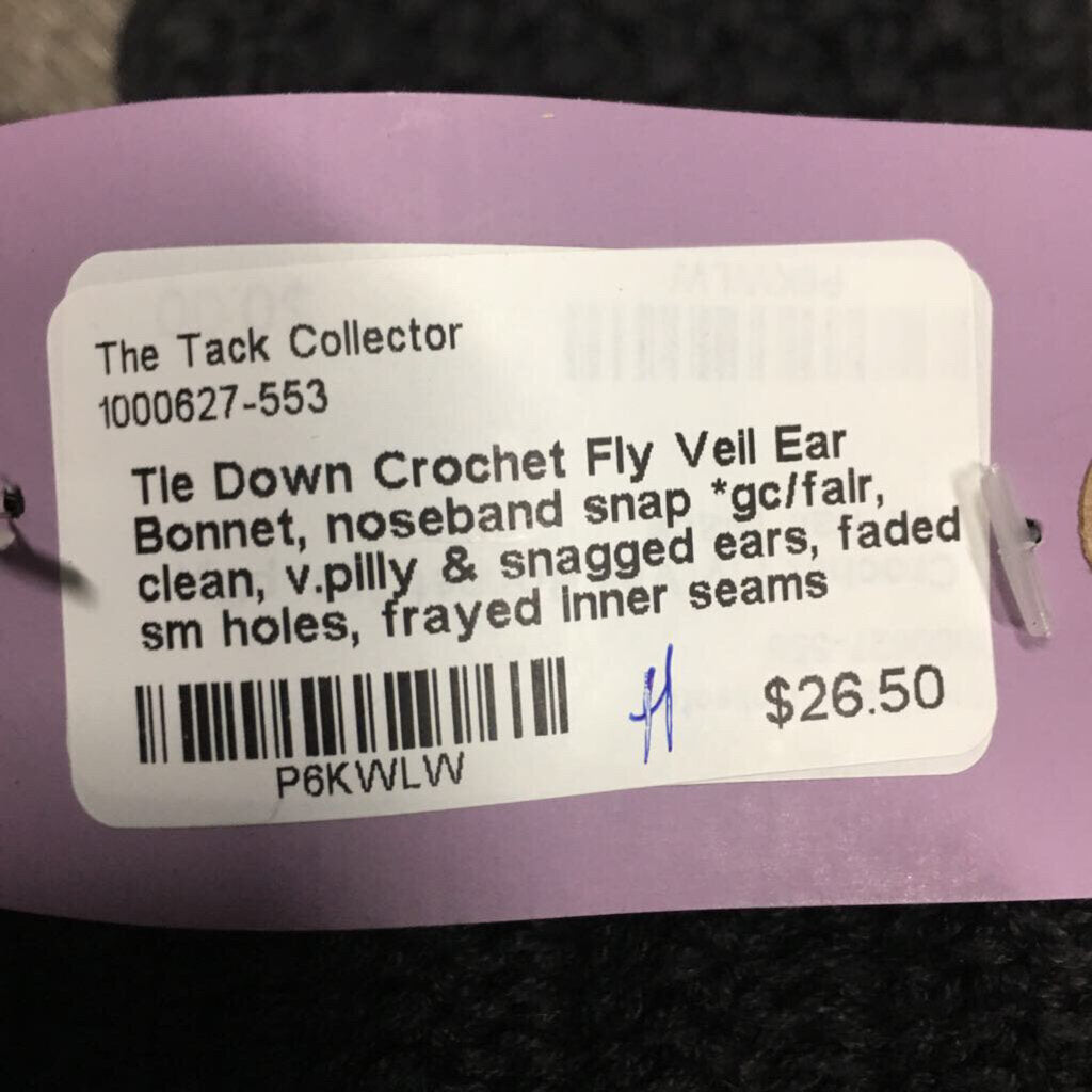 Tie Down Crochet Fly Veil Ear Bonnet, noseband snap *gc/fair, clean, v.pilly & snagged ears, faded, sm holes, frayed inner seams