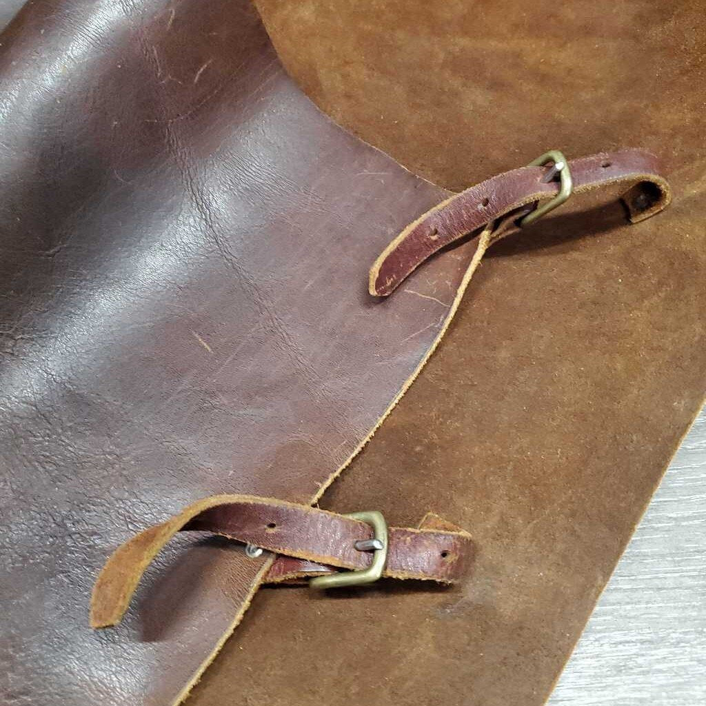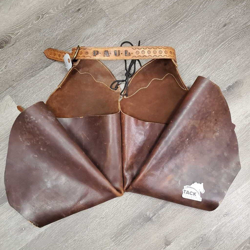 v.thick Hvy Leather Chinks, "Paul", string front strap *gc, scuffs, salt stains?film, scratches, mnr edge chews?scrapes