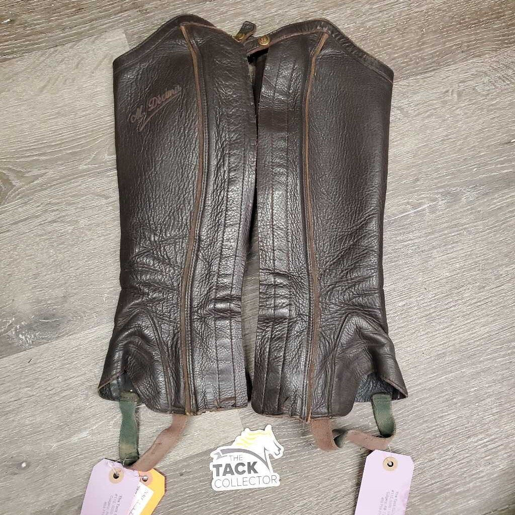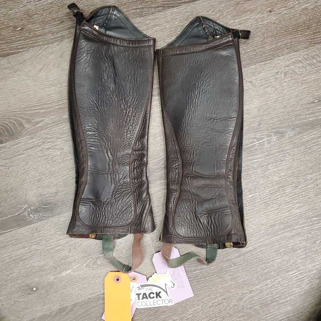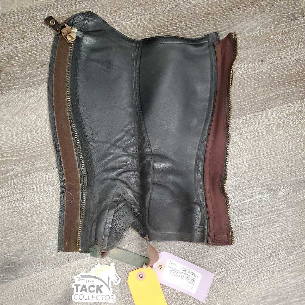 v.Thick Leather Half Chaps, Back Zips & velcro *gc, older, velcro: v.loose & hairy, v.creased & puckered