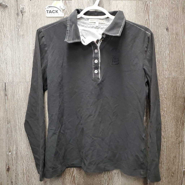 LS Polo Shirt, 1/3 Button Up *gc, faded, puckered trim & collar, hair, older?, seam puckers, curled collar end Iris Bayer Size: S