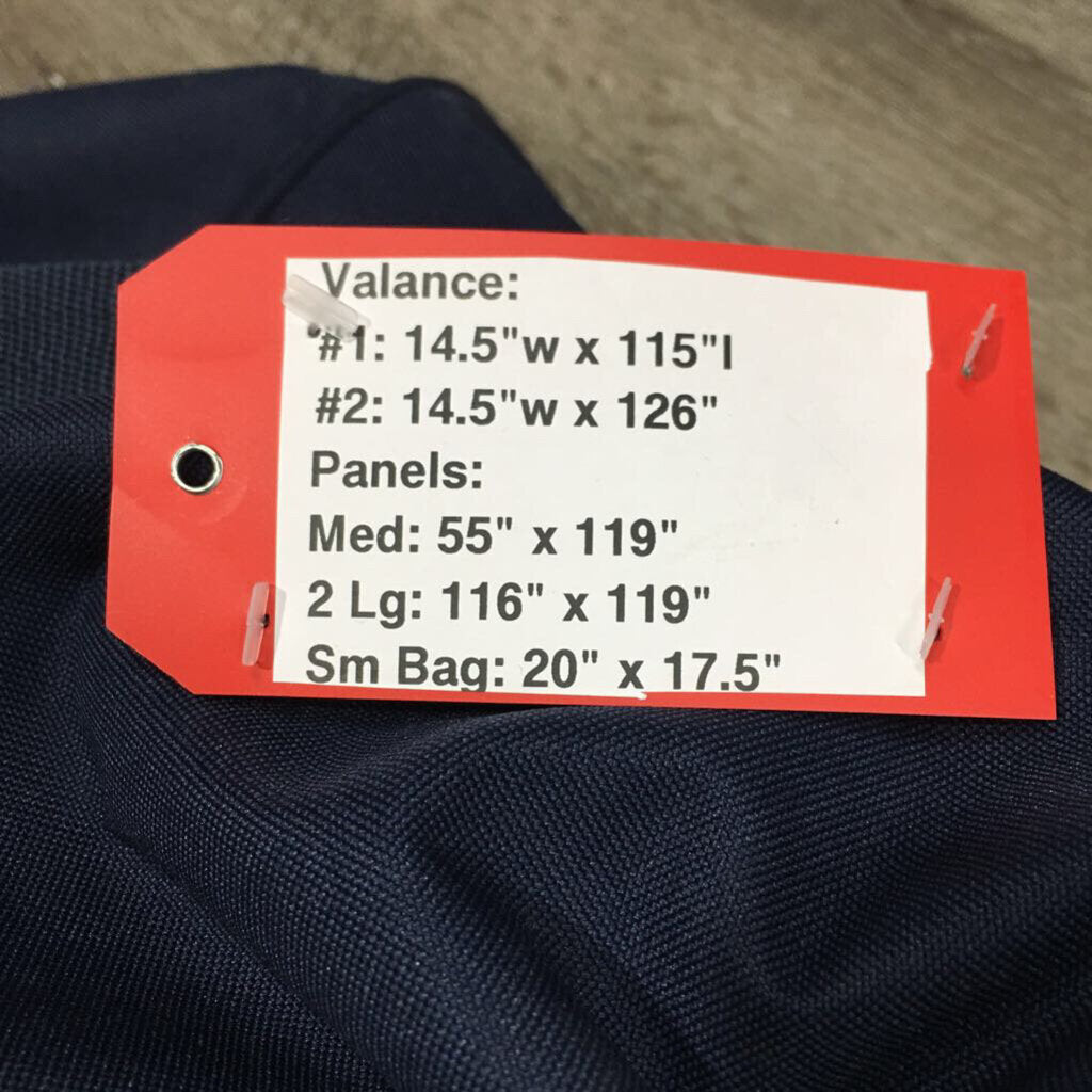 Valance: #1: 14.5"w x 115"l #2: 14.5"w x 126" Panels: Med: 55" x 119" 2 Lg: 116" x 119" Sm Bag: 20" x 17.5"