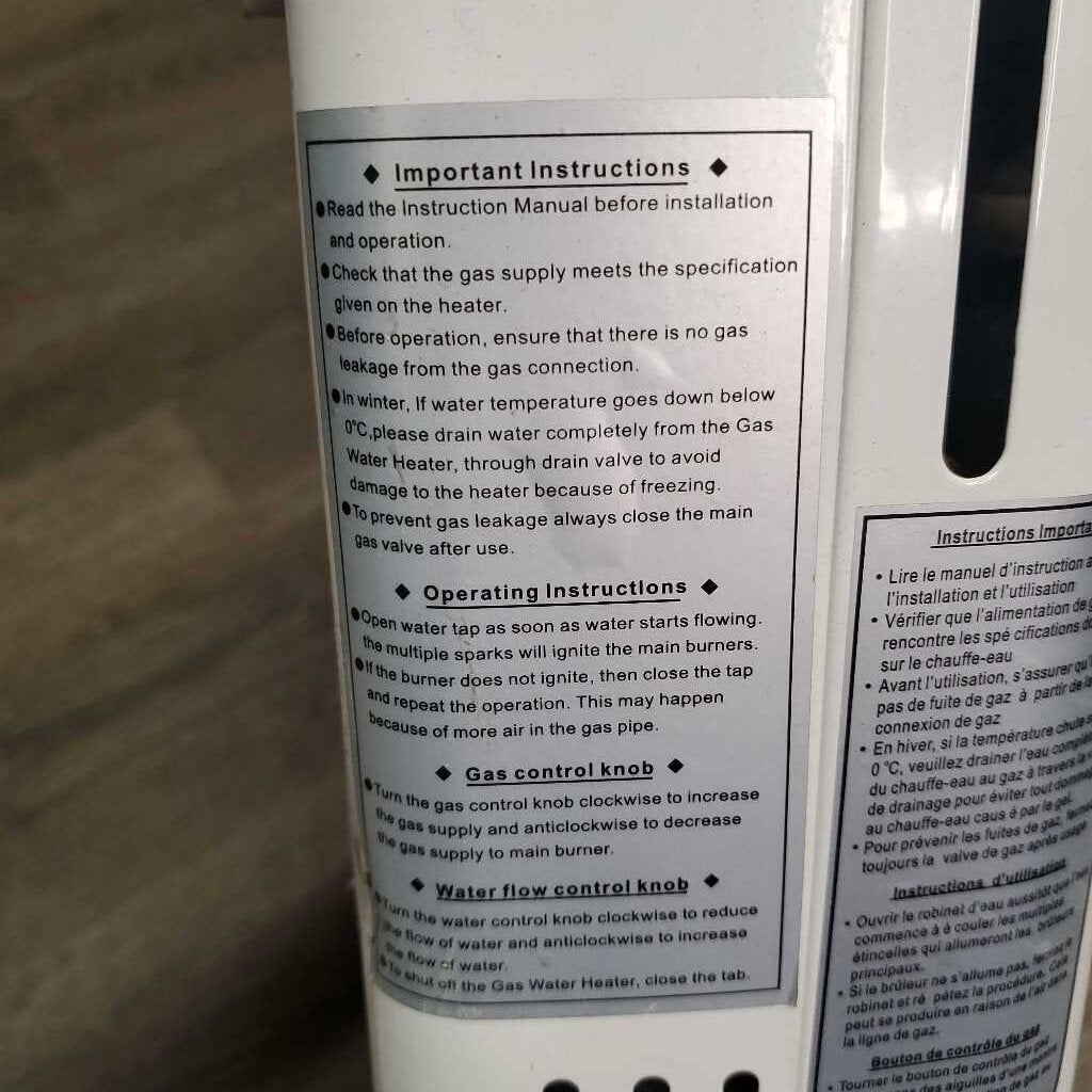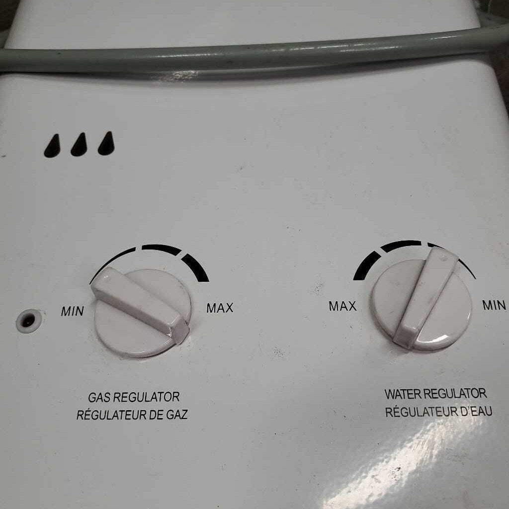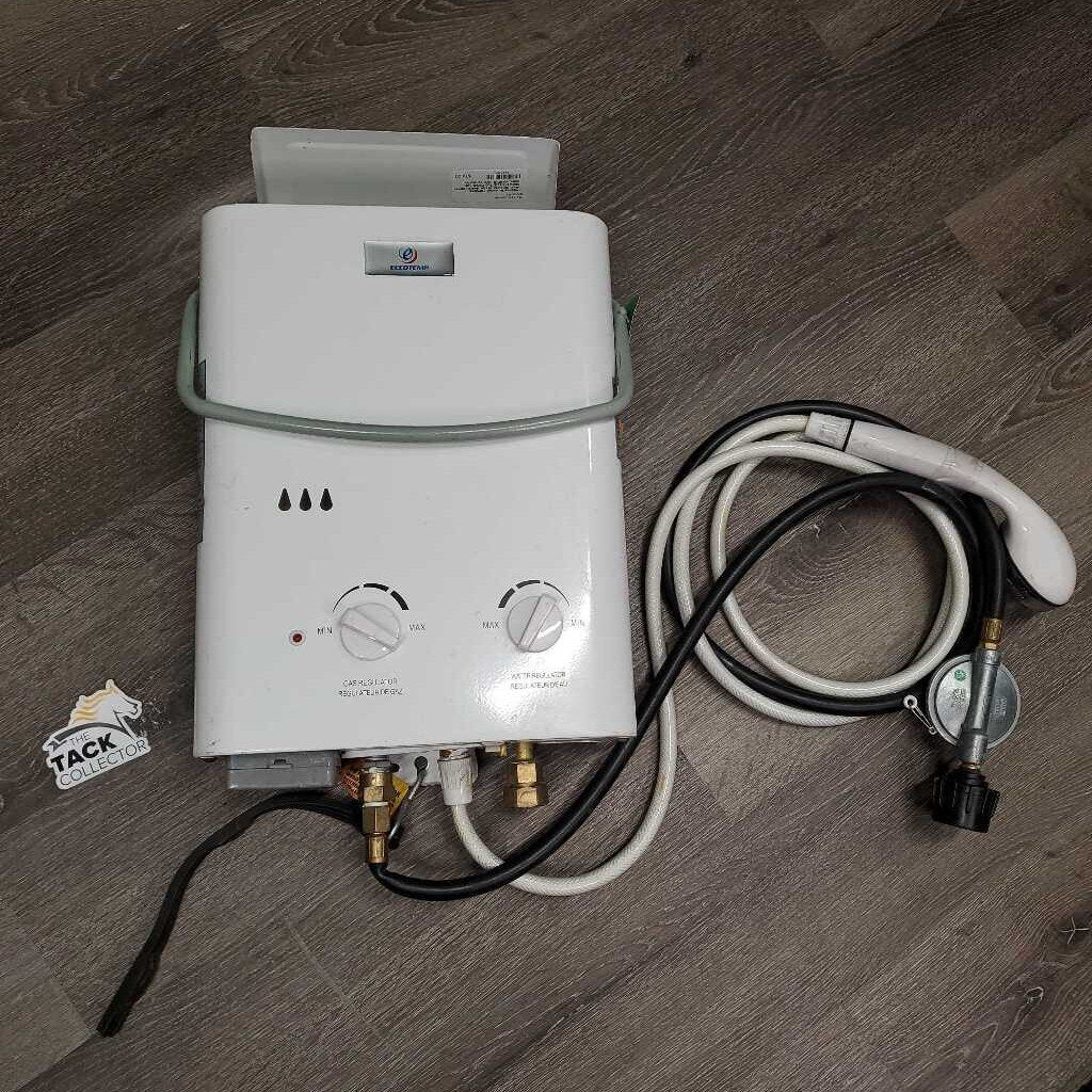 Propane Powered Tankless Wash/Shower Water Heater, hoses, Shower Head, Top Cover *gc, older, WORKS, dirt, scratches, stains