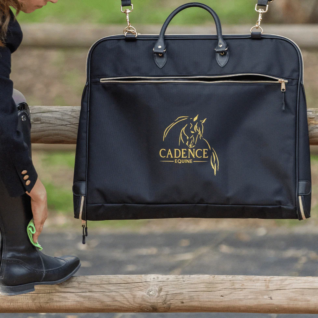 Discover the perfect blend of style and functionality with our Equestrian Garment Bag. Designed for the discerning equestrian, this luggage collection promises unmatched durability and exquisite craftsmanship. Unmatched Durability Constructed from 1680D Military-Grade Ballistic Nylon for ultimate toughness. Custom YKK Zippers Enjoy smooth and durable zipper functionality with premium YKK zippers. Showerproof Protection Keep your gear dry and protected with our showerproof design. Convenience and Versatility Equipped with 3 separate clothing hooks to keep your attire organized and show ready. Essential Storage Features dedicated exterior and interior pockets for all your show essentials. Fold and Go Convenient foldable design for easy transportation and storage. Multiple Carrying Options Choose between a padded shoulder strap, ergonomic leather handles, or convenient stall hanging straps for versatile carrying.