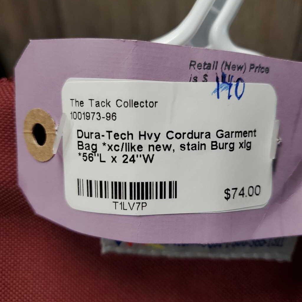 Dura-Tech® Extra Long Garment Bag Keeps clothing clean and organized while on the road Perfect for Saddle Seat and Show Hack jackets 600 denier polyester outer with hanger slot Side zipper and large front zippered pocket Ideal for awards - can be personalized easily Measures 56"L x 24"W