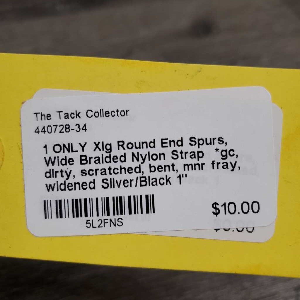 1 ONLY Xlg Round End Spurs, Wide Braided Nylon Strap *gc, dirty, scratched, bent, mnr fray, widened