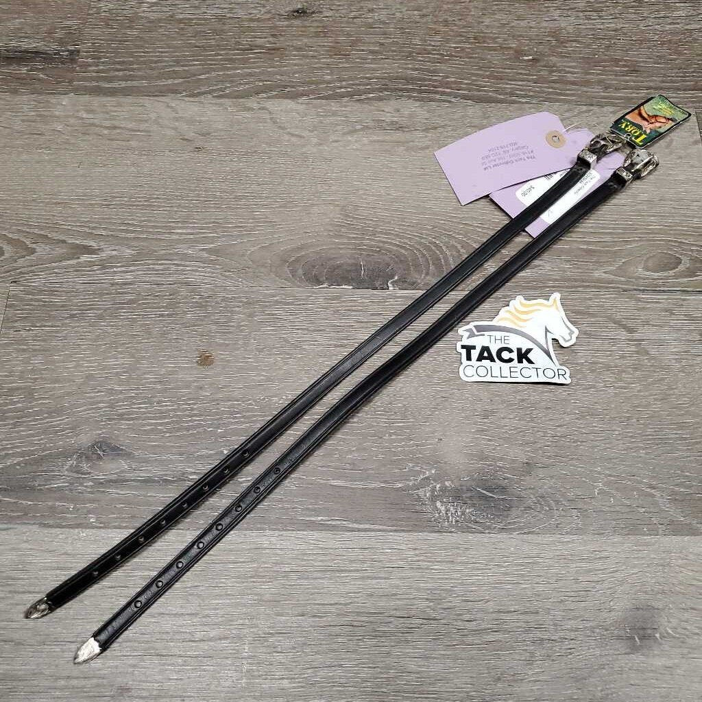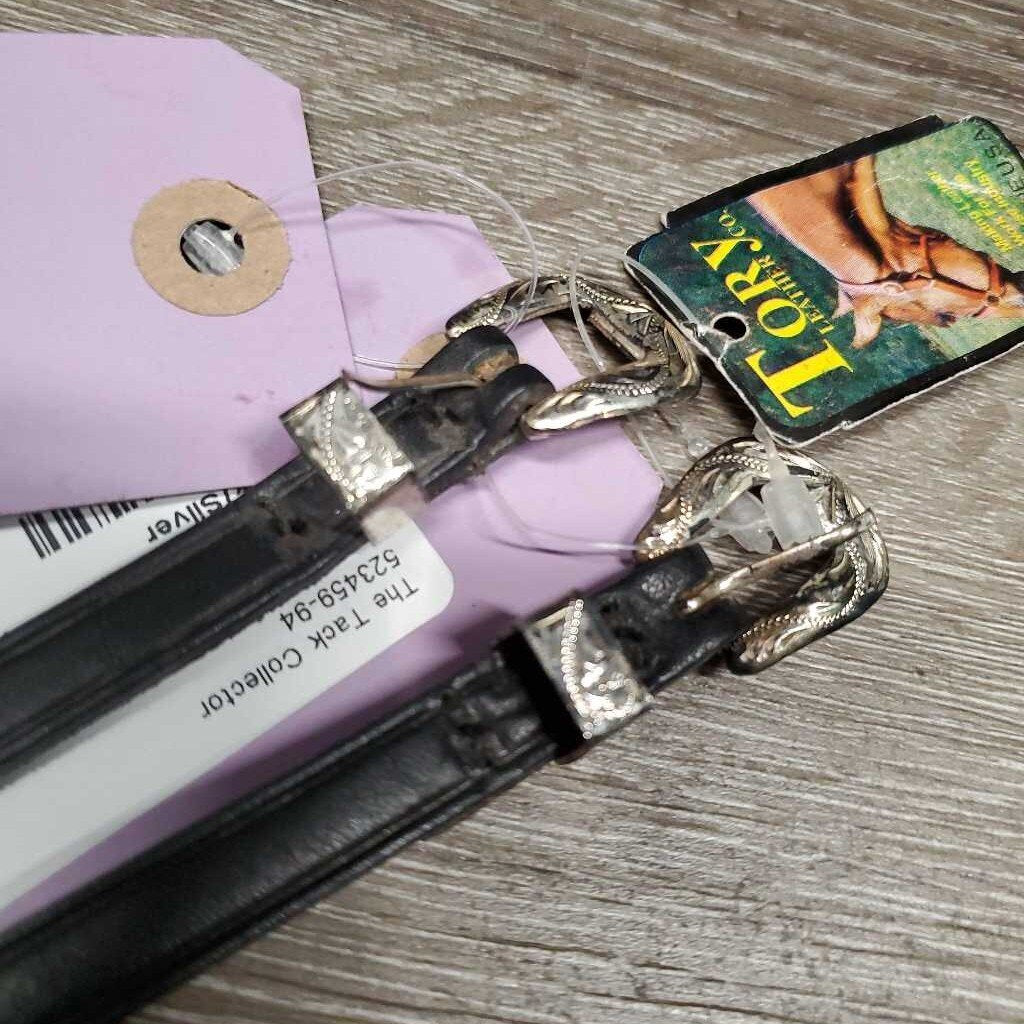 3/8” Wide x 18” Long English Bridle Leather Strap with a Silver Plate Buckle Set. The Tips are able to be removed to fit through the spur slots