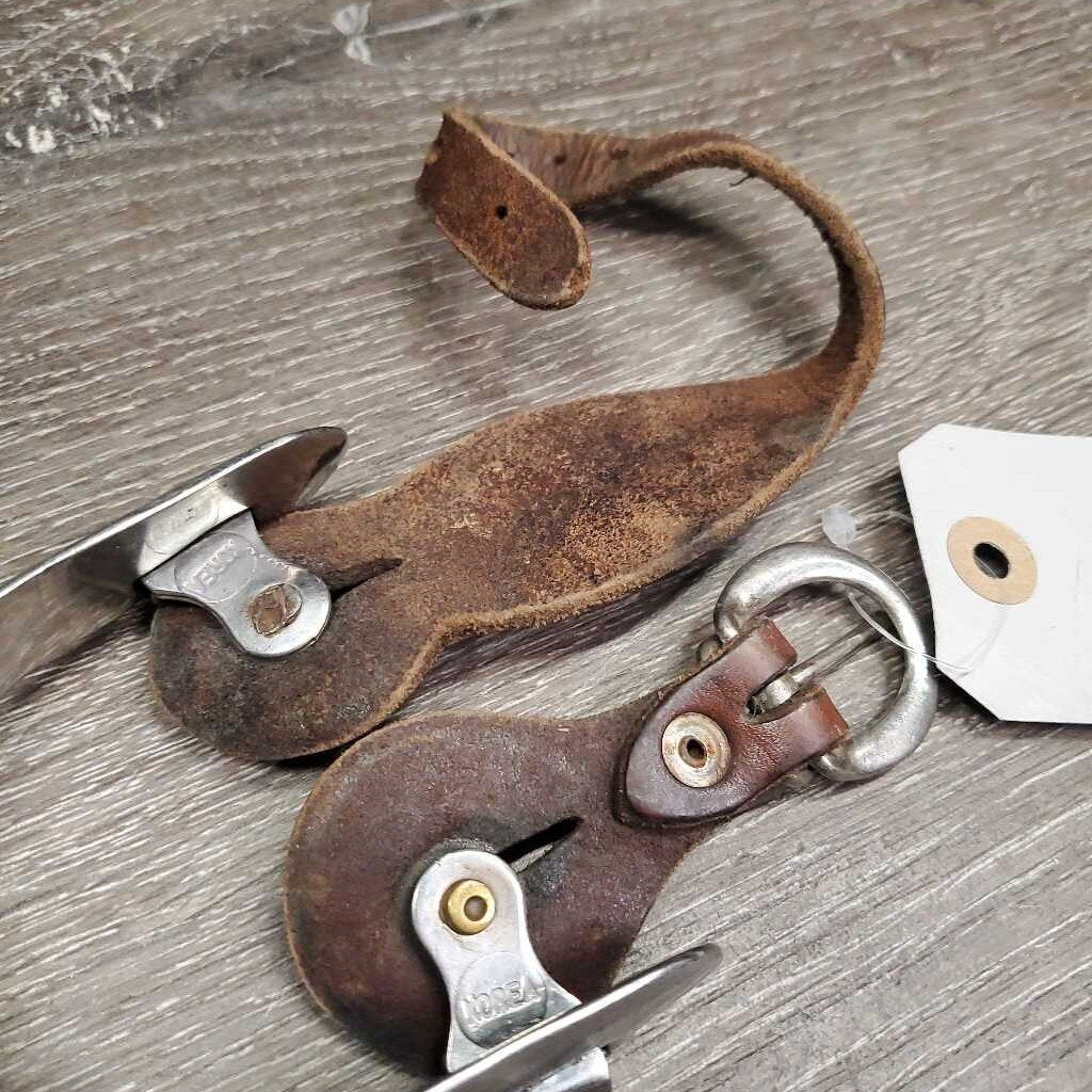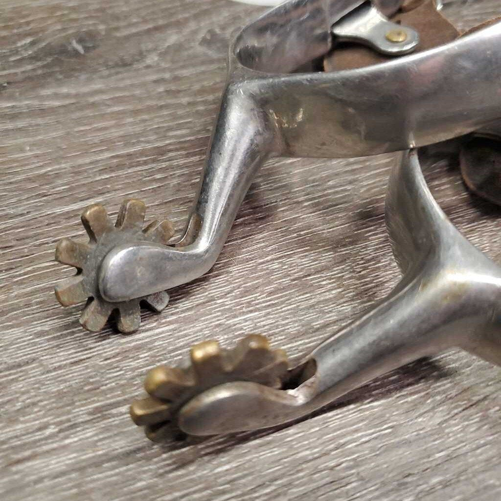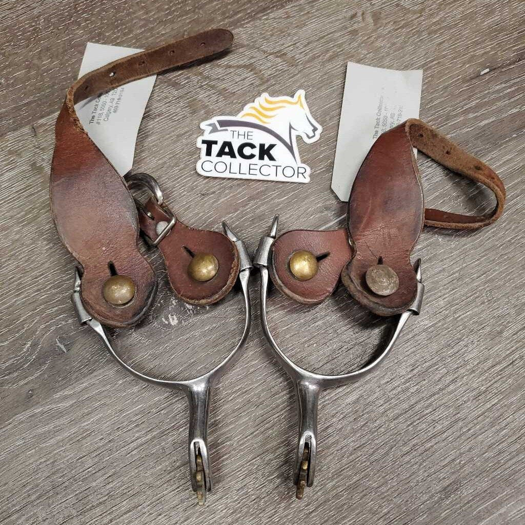 Pr Western Rowel Spurs, Smooth Leather Spur Straps *gc, clean, scratches, rubs, stains, sliced strap edges