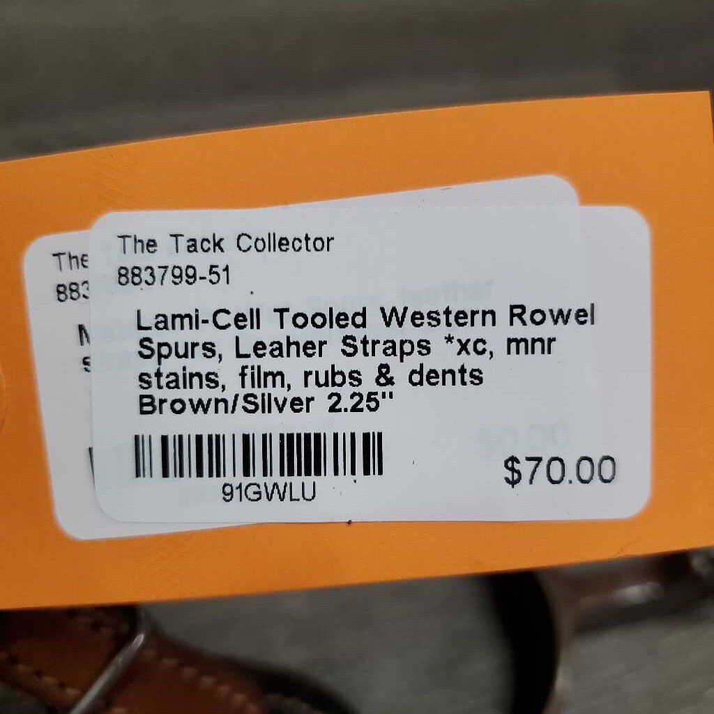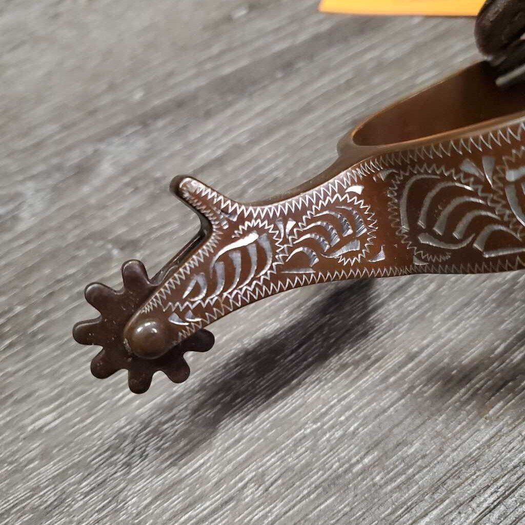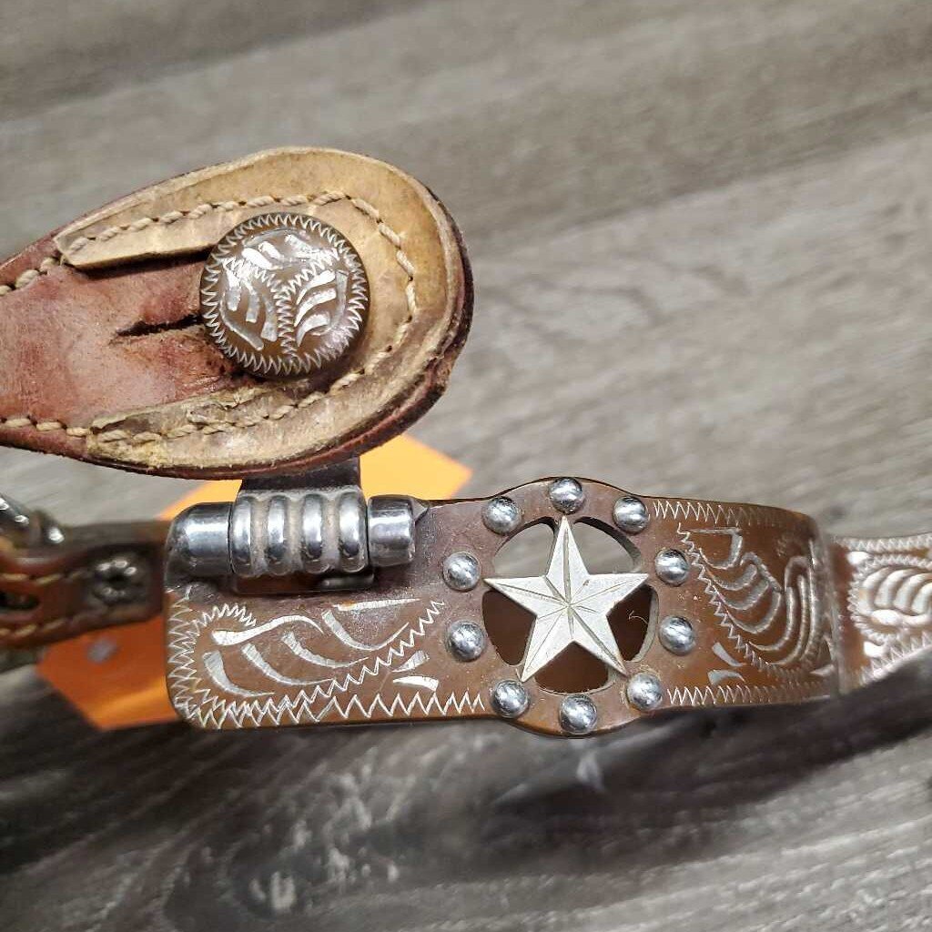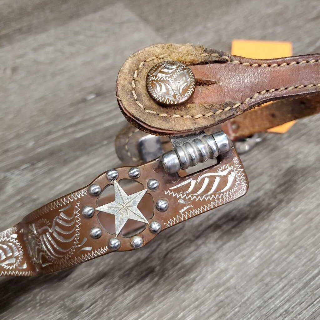 Tooled Western Rowel Spurs, Leaher Straps *xc, mnr stains, film, rubs & dents
