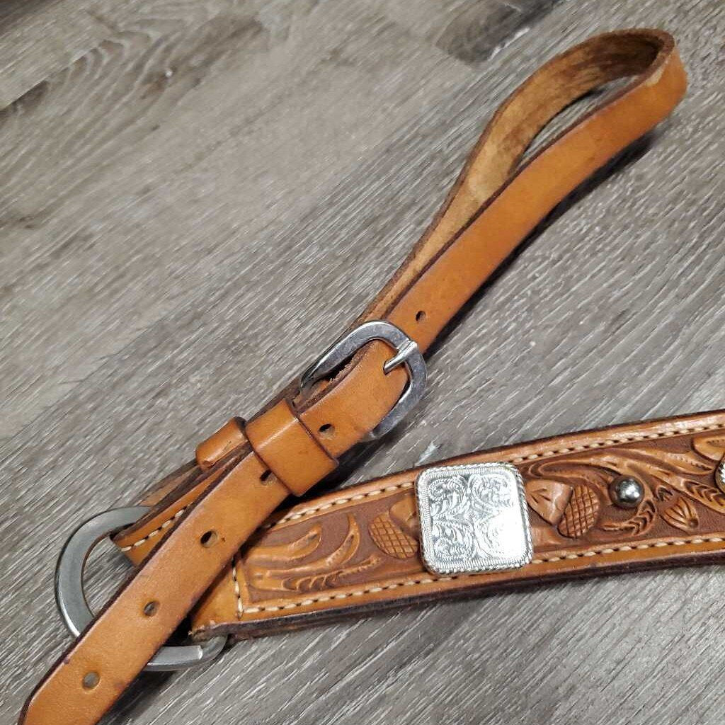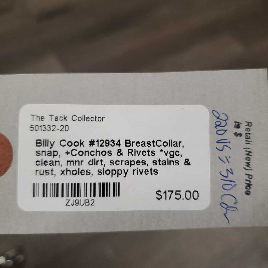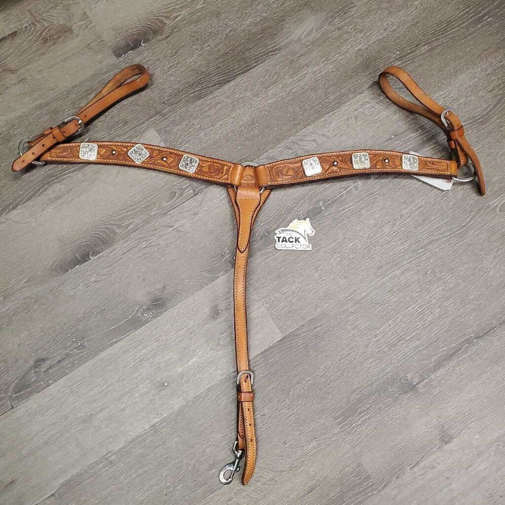 #12934 BreastCollar, snap, +Conchos & Rivets *vgc, clean, mnr dirt, scrapes, stains & rust, xholes, sloppy rivets