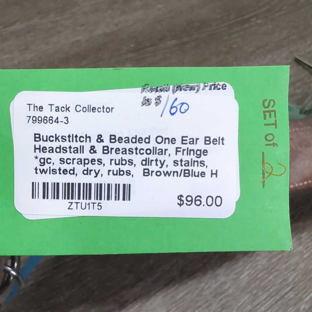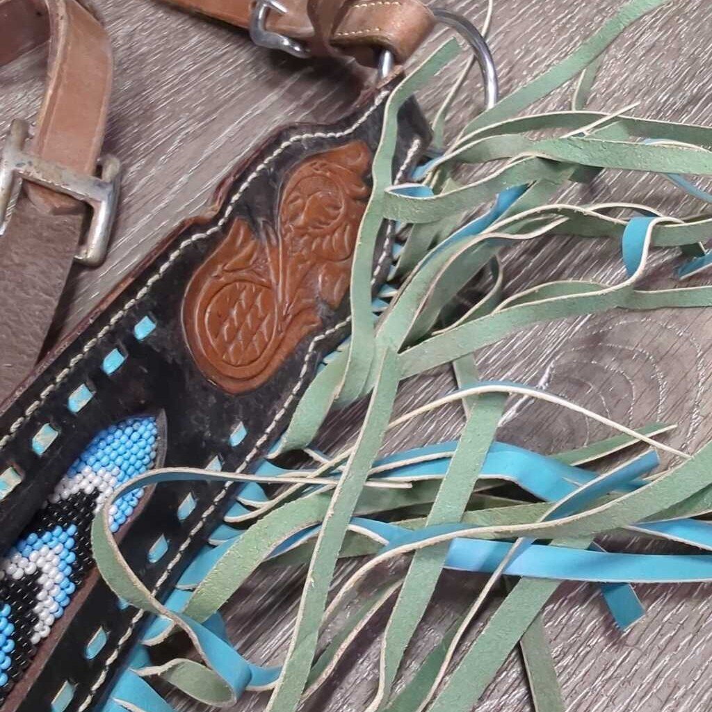 Buckstitch & Beaded One Ear Belt Headstall & Breastcollar, Fringe *gc, scrapes, rubs, dirty, stains, twisted, dry, rubs