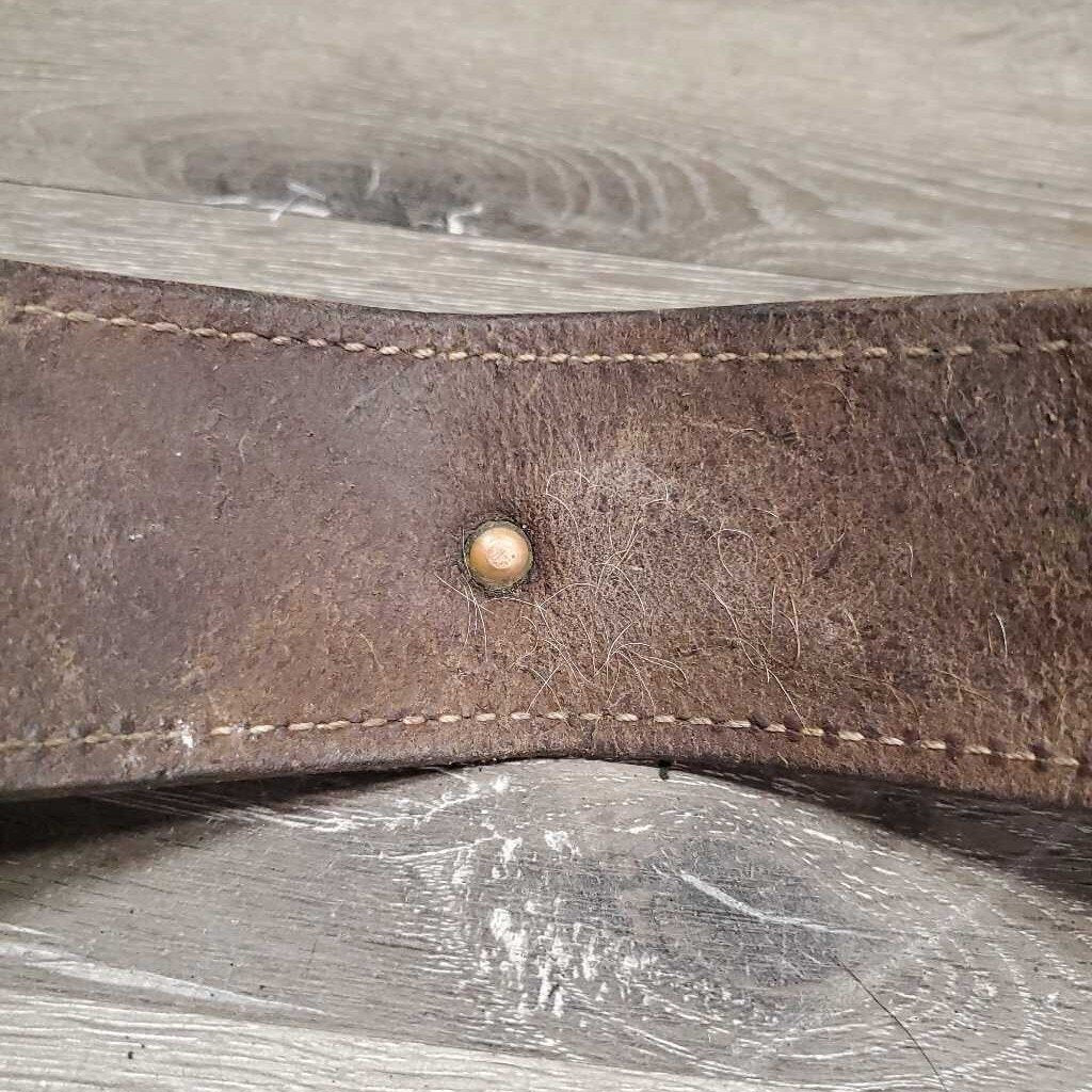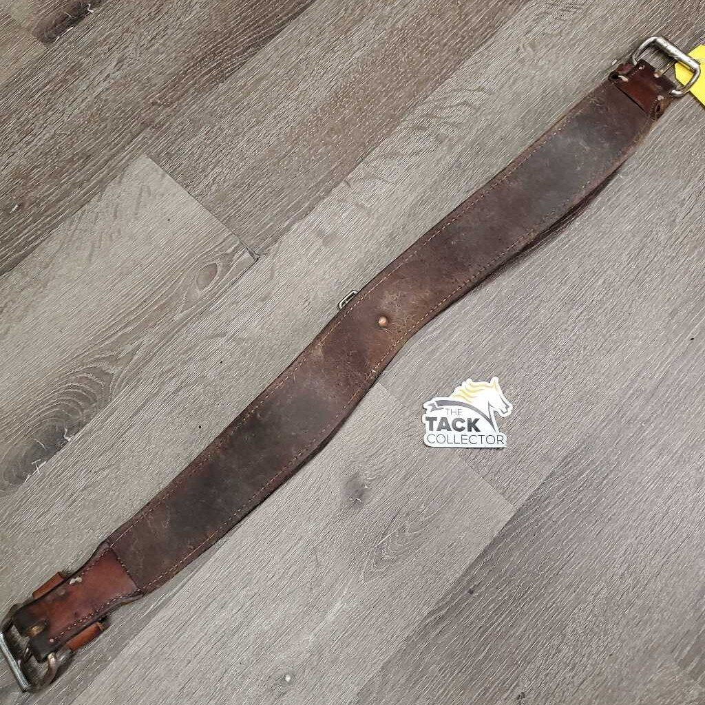 Flat 2.5" Leather Back Cinch, Center Buckle *gc, older, bent, rubs, scrapes, mnr dirt & stains