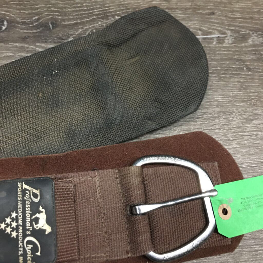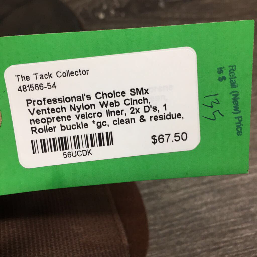 Nylon Web Cinch, neoprene velcro liner, 2x D's, 1 Roller buckle *gc, clean & residue, dusty, stains, mnr curled edges & hair, older