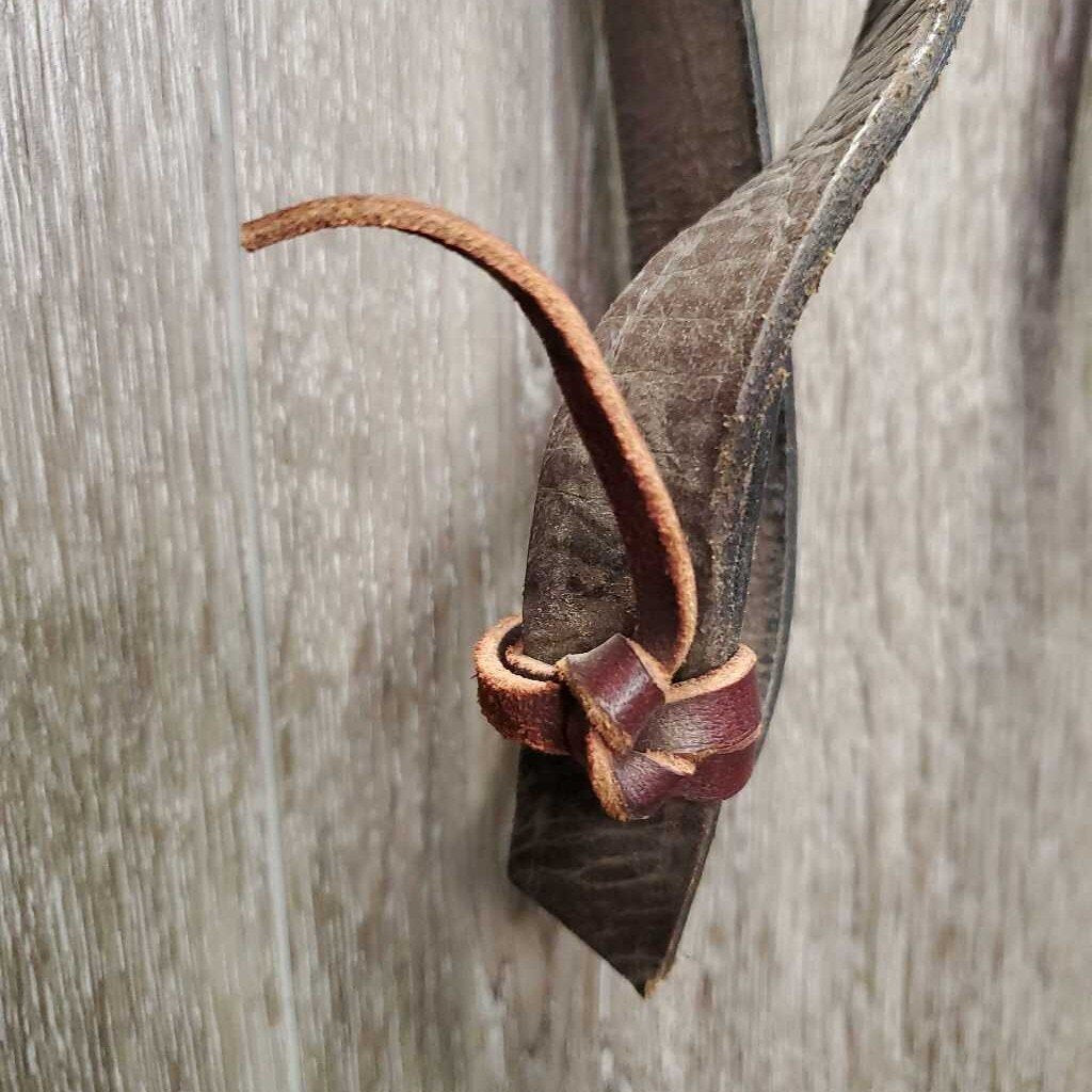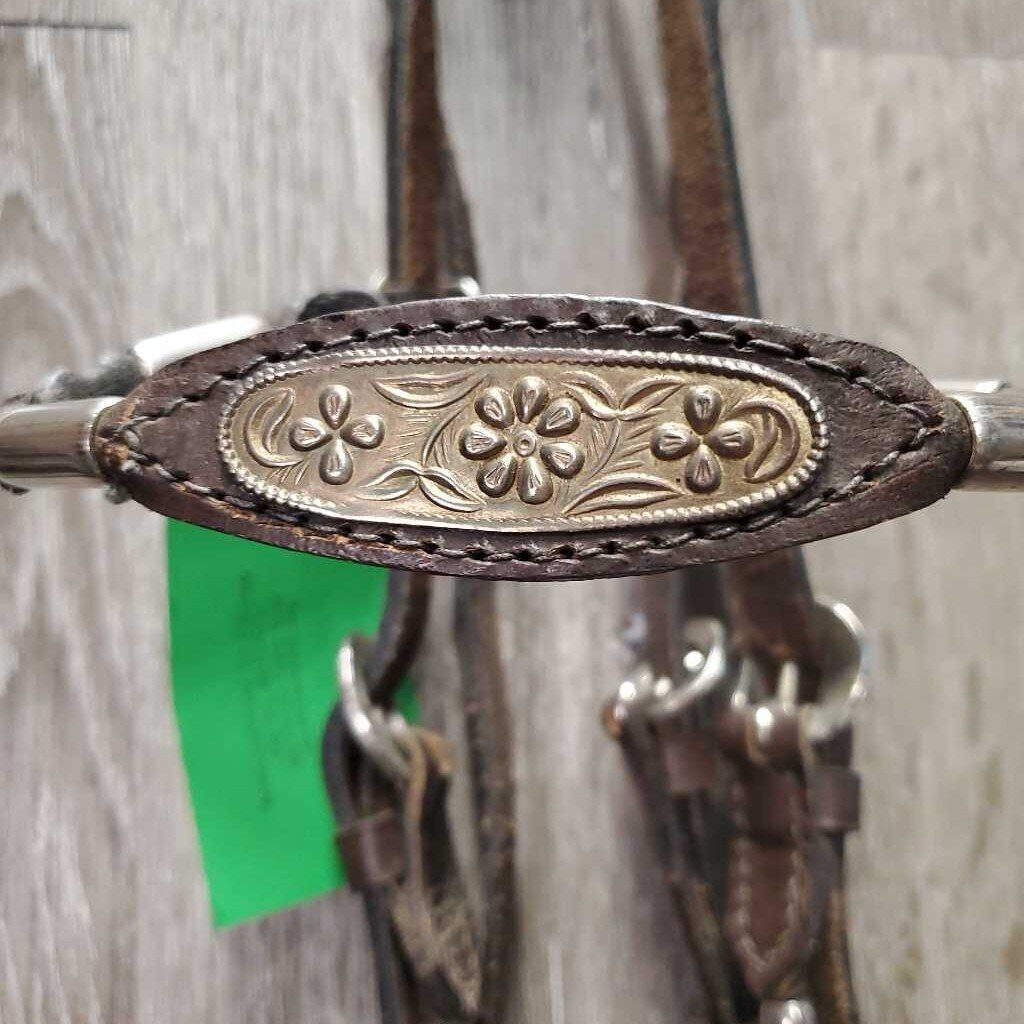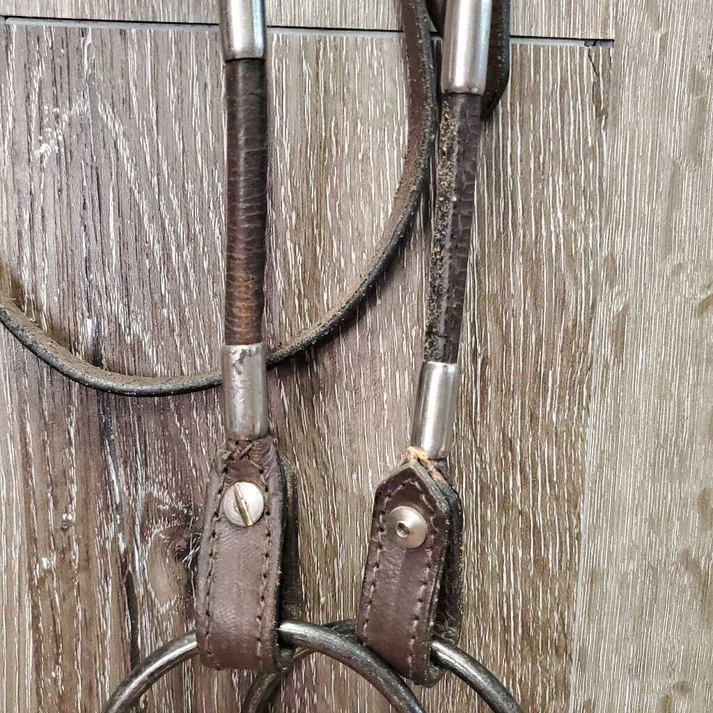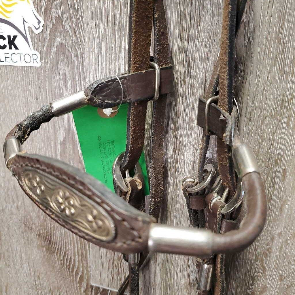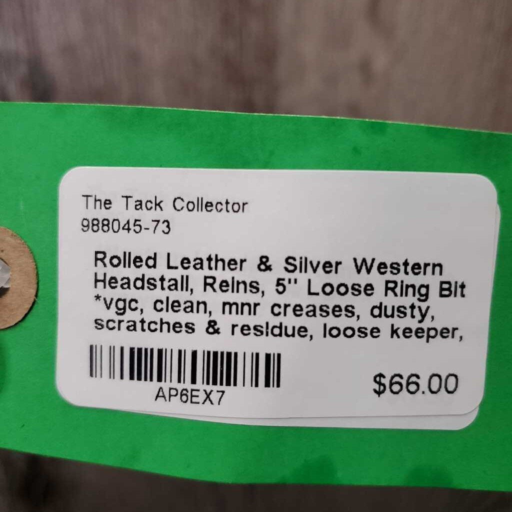 Rolled Leather & Silver Western Headstall, Reins, 5" Loose Ring Bit *vgc, clean, mnr creases, dusty, scratches & residue, loose keeper, mnr stiff & dry