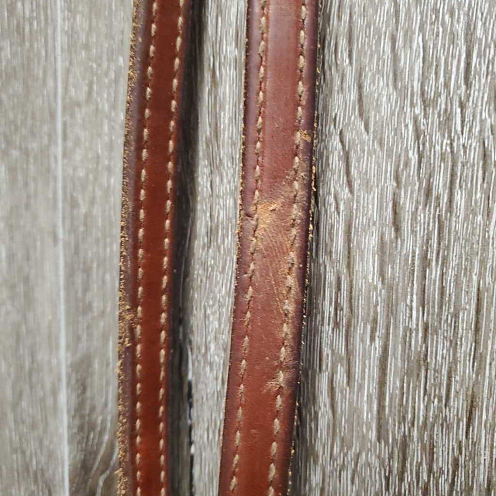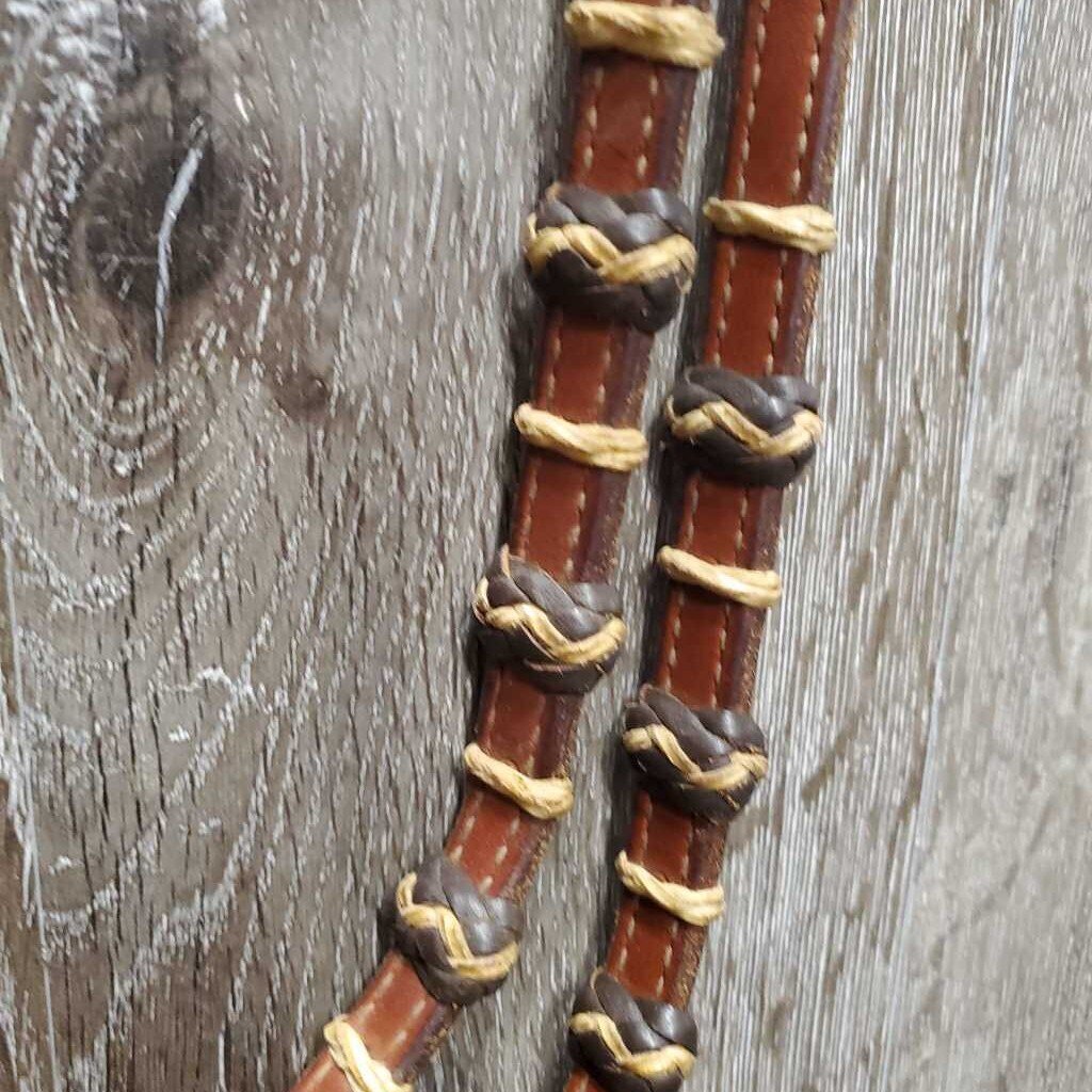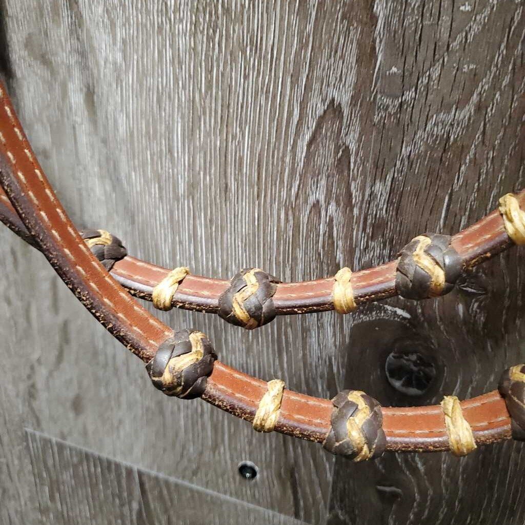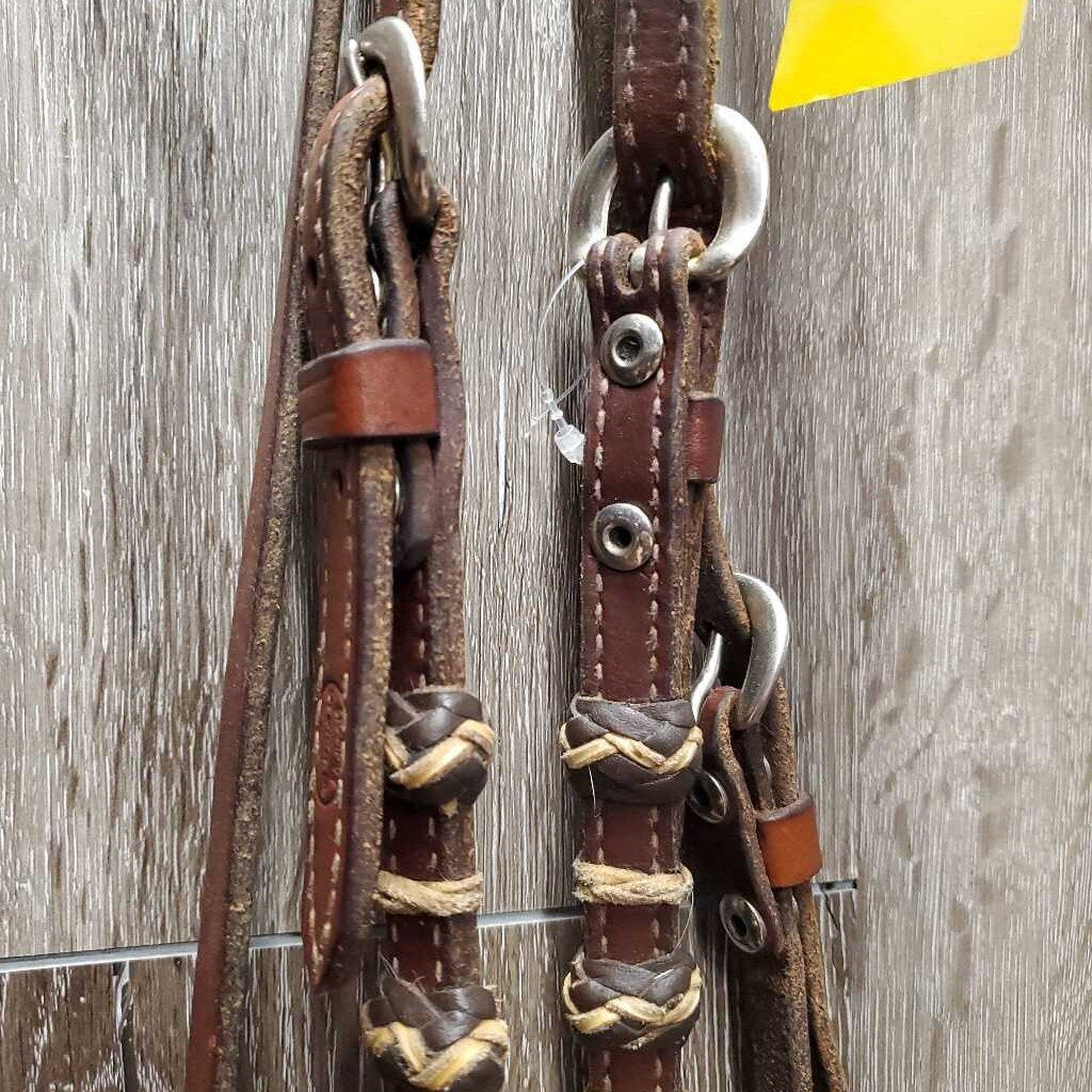 SoftWestern Headstall, Rawhide Buttons, Silver, Chicago Screws, Split Reins *vgc, clean, mnr scrapes, stains & chews, loose silver & stitching