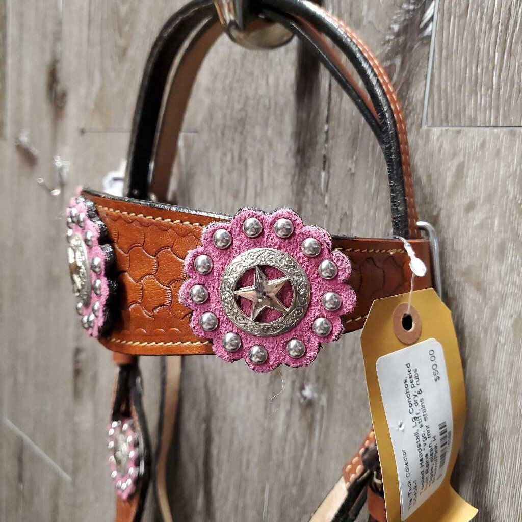 Tooled Headstall, Lg Conchos, Split Reins *vgc, stiff, dry, peeled edges, clean, mnr stains & rubs