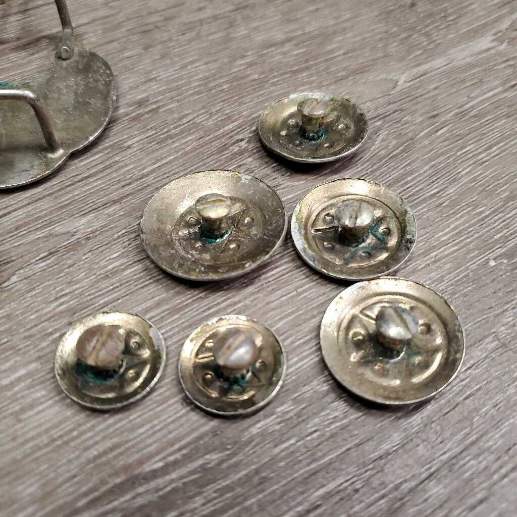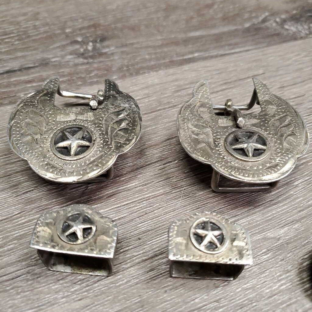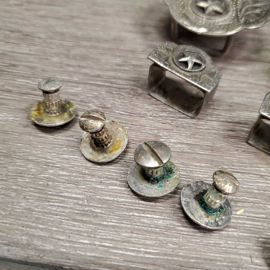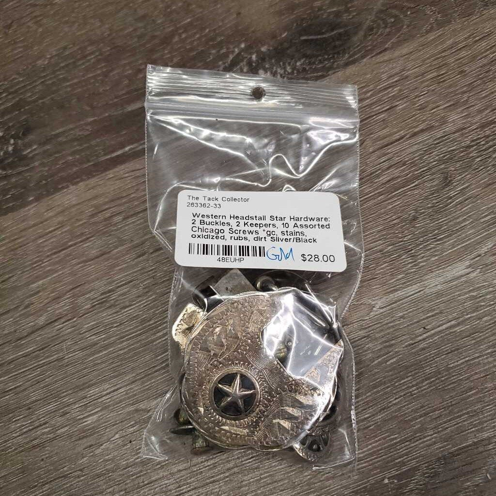 Western Headstall Star Hardware: 2 Buckles, 2 Keepers, 10 Assorted Chicago Screws *gc, stains, oxidized, rubs, dirt