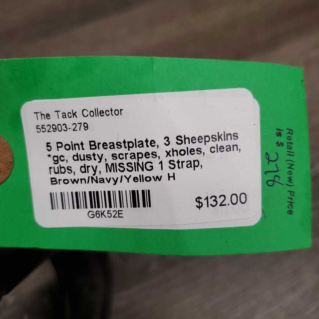 5 Point Breastplate, 3 Sheepskins *gc, dusty, scrapes, xholes, clean, rubs, dry, MISSING 1 Strap