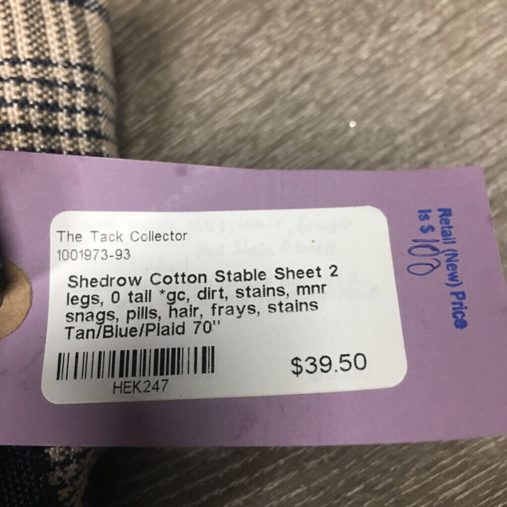 Cotton Stable Sheet 2 legs, 0 tail *gc, dirt, stains, mnr snags, pills, hair, frays, stains