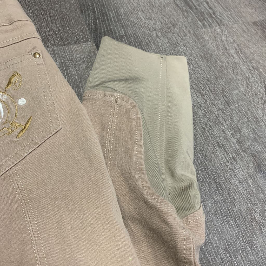 Euro Seat Breeches *loose threads, v.discolored/stained seat & legs, seam puckers, faded, undone stitching, stains