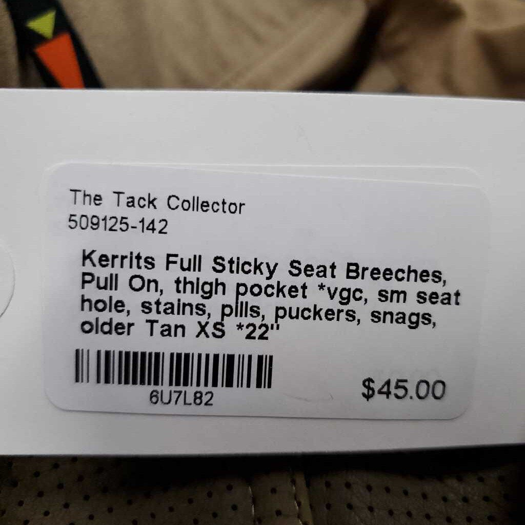 Full Sticky Seat Breeches, Pull On, thigh pocket *vgc, sm seat hole, stains, pills, puckers, snags, older