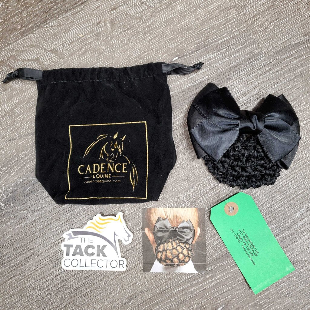 Cadence Equine's Equestrian Bow and Bun Cover: the perfect blend of elegance and functionality for riders who demand both style and practicality. Available in timeless black and navy variations. Ultra-Stretchy Crochet Net: Crafted with a durable elastic cord, our bun cover features an ultra-stretchy crochet net, accommodating long, thick hair effortlessly. Ideal for All Lengths of Hair: Whether you have mid-length hair or long, thick locks, our knot-free hair net is perfect for all lengths of hair, neatly holding it out of the way for a polished and professional look. Luxurious Velvet Pouch: Each bun cover comes with a soft, luxurious velvet pouch, providing a safe and dust-free storage solution for your tack box. Easy to Use: Engineered for ease, our bun cover effortlessly slips into your hair, ensuring a hassle-free styling experience. Durable Clip Design: Featuring a durable clip design, our bun cover stays securely in place throughout your ride. Upgrade your equestrian sty...