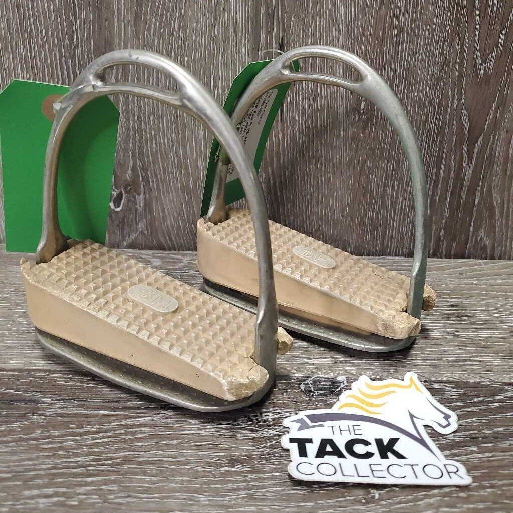 Pr HS Angled Stirrup Irons *fair, older, tape, scuffed, oxidization, foot grips- rubbed, dry, cracking, stained